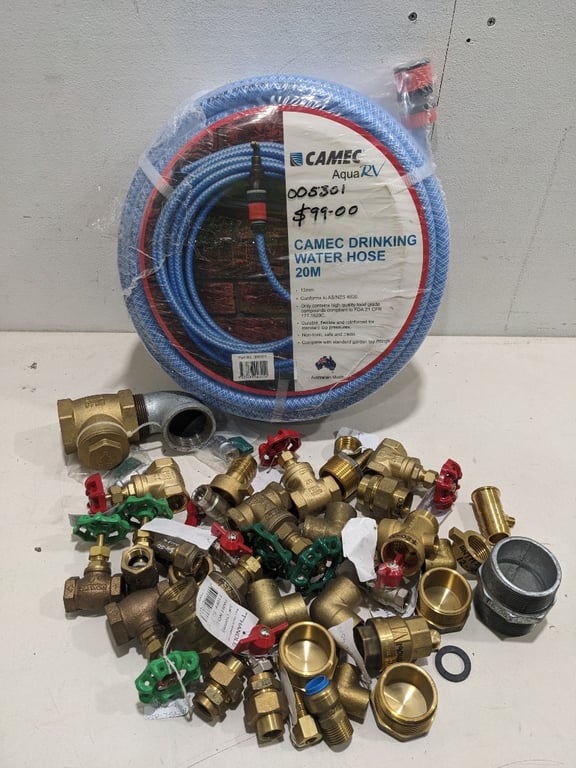 Assorted industrial brass plumbing valves and fittings various sizes-shapes and camec drinking water hose 20m.Sold as a lot
