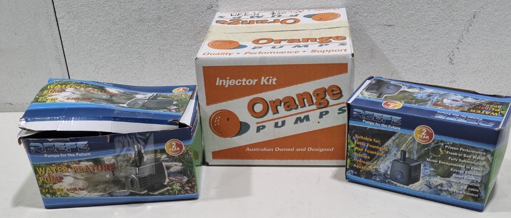 Water pump and pressure pump lot, includes reefe water feature pump and orange pump water pressure kit. Model: wk10b Sold as lot Note: untested
