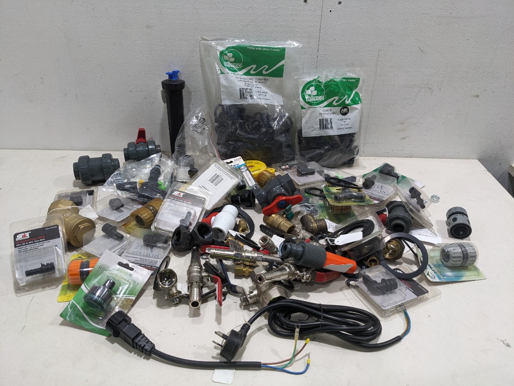 Assorted industrial garden and irrigation fittings, valves and items, includes garden hose connectors, brass ball valves, and more...Sold as a lot.