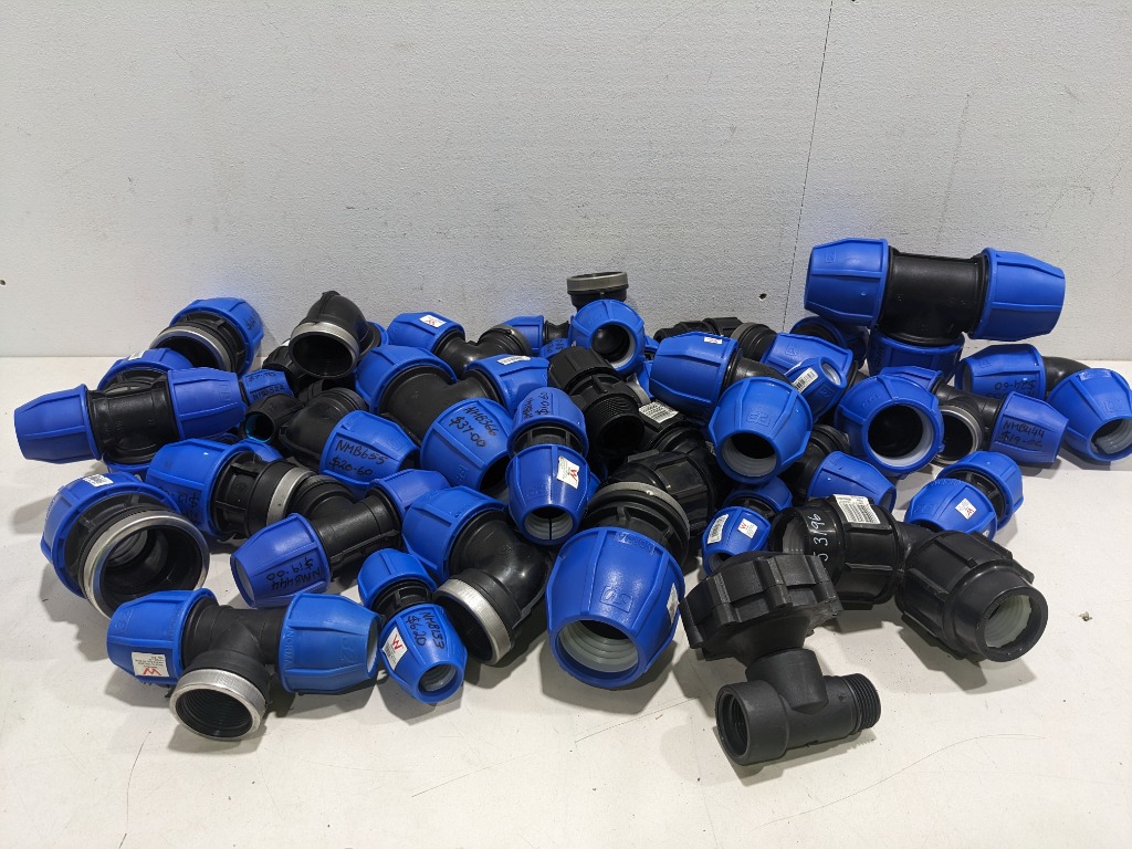 Assorted industrial pipe fittings blue and black, includes elbows, tees, coupling and more...Sold as a lot.