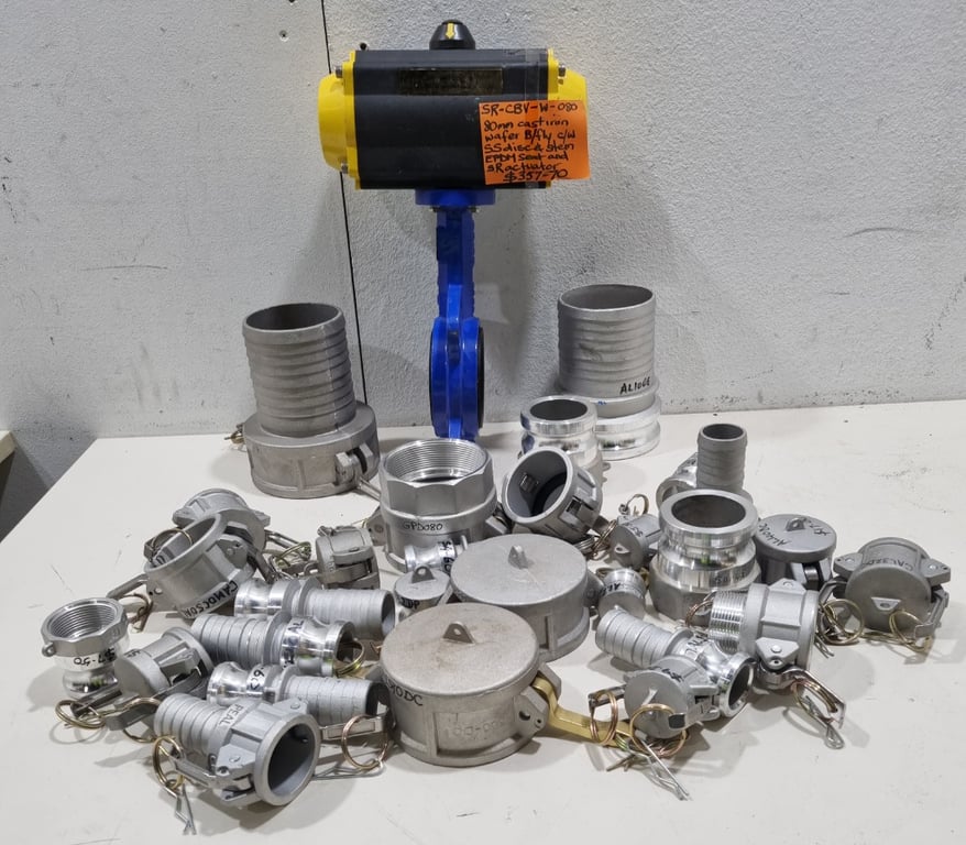 Assorted industrial item and fittings lot, includes cast iron wafer butterfly ss/disc and stem model: dfs085-sr10-mp and galvanised camlock fittingsSold as lot