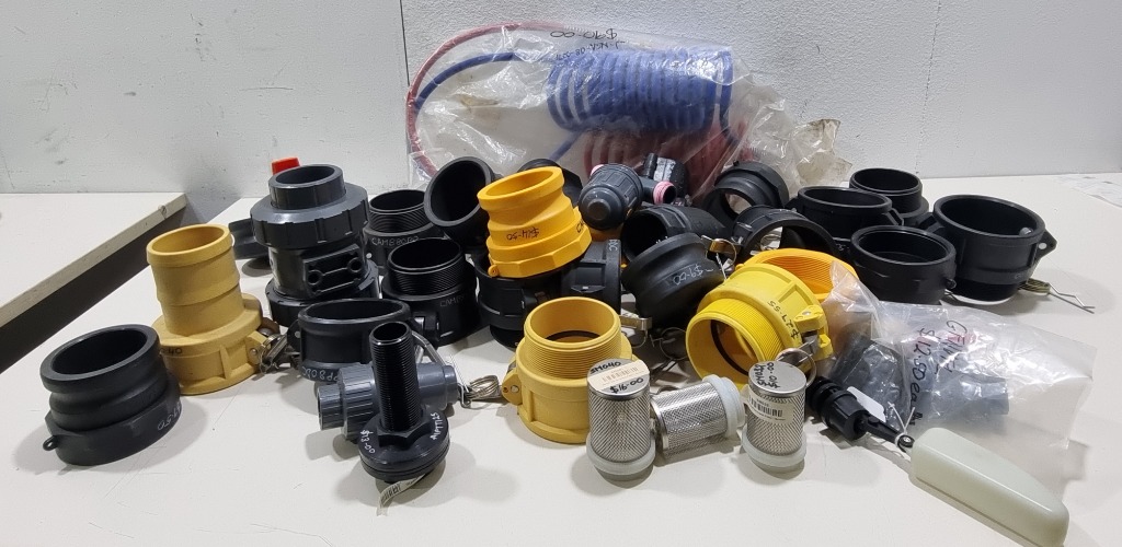 Assorted industrial fittings, includes plastic valves,truck hose kit and more...... Sold as lot