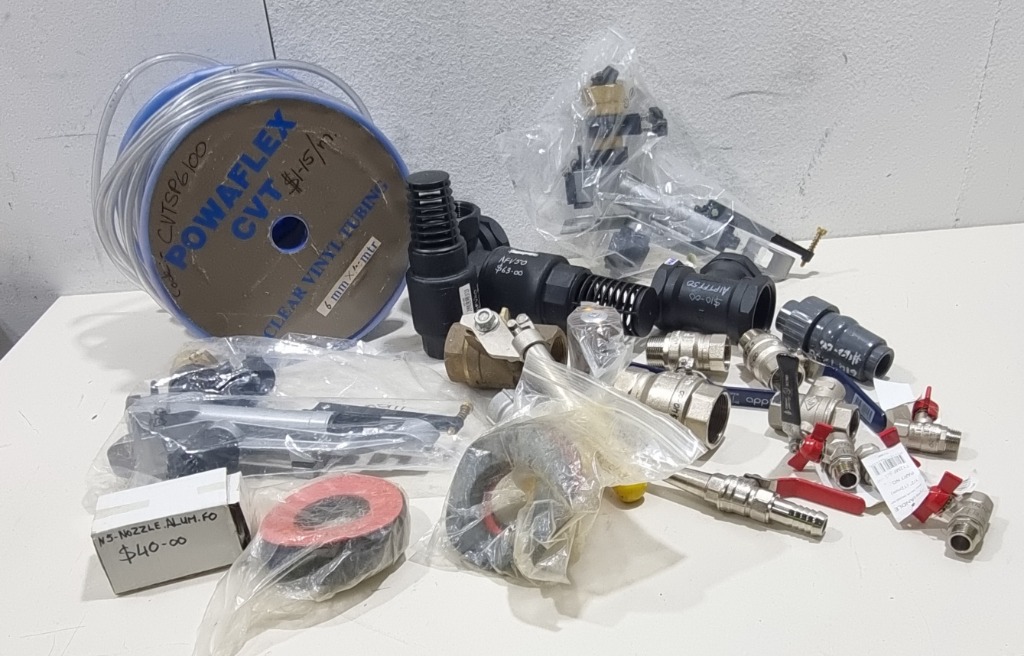 Assorted industrial items and fittings,includes powaflex clear vinyl tubing, irrigation sprinklers and more....... Sold as lot