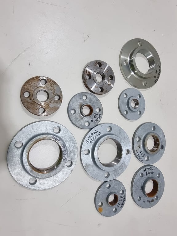 Galvanised threaded pipe flange lot, includes various shapes. Sold as lot Note: Signs of rust visible