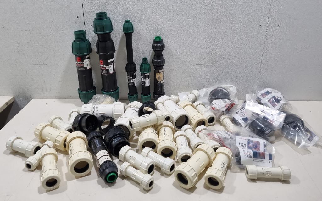 Assorted industrial fittings, includes pvc fittings, plasson bucchi tank adaptors(multiple sizes), guyco telescopic compression repair joiner, for polypipe and more....... Sold as lot