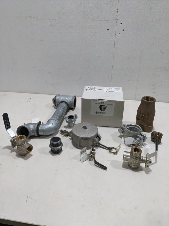 Equipco E400 diesel flow meter and assorted industrial fittings and valves, includes heavy-duty coupling, multiple ball valves, etc..Manual instructions included.Sold as a lot