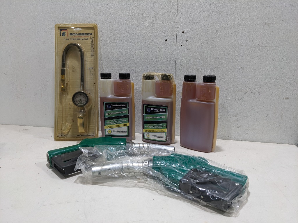 Assorted industrial items, includes sonsbeek car tyre inflator with gauge, bottles of techno-kleen all fuel concentrate x3, fuel dispensing nozzles x2.Sold as a lot.