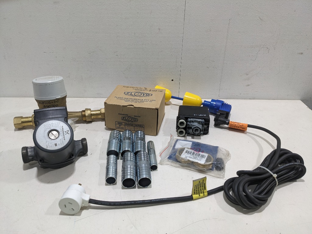 Assorted industrial items, includes circulation pump, brass valve assembly, float switch and more...Set as a lot.Note: Untested.