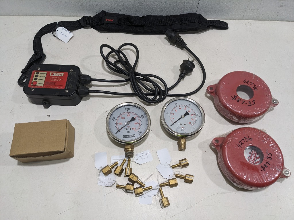 Assorted industrial items, includes pressure control switch, pressure gauges x2, lockout safety covers x2 and more...Sold as a lot.Note: Untested