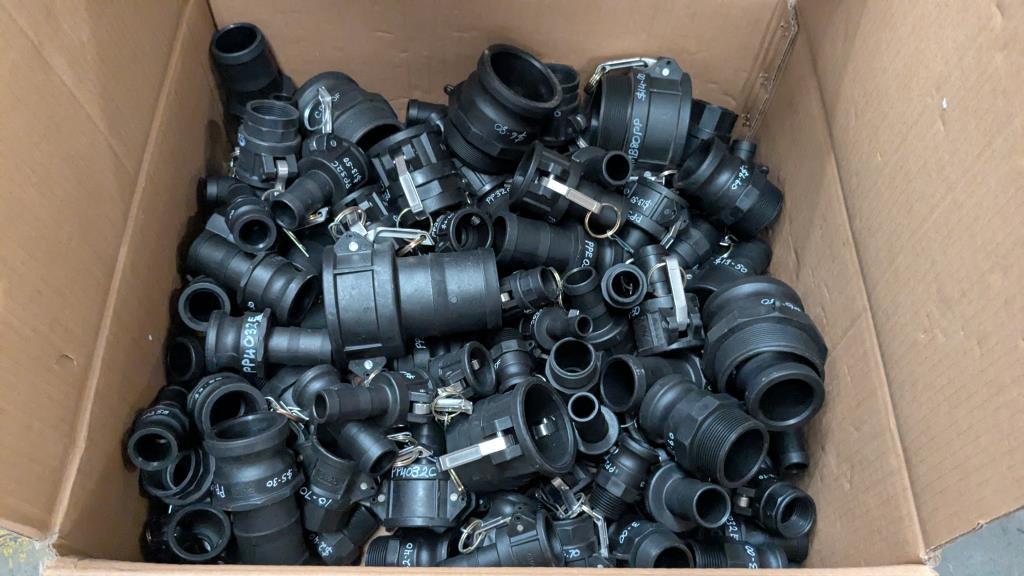 Assorted industrial fittings, includes variety of male and female camlock couplers, different sizes ranging approx. From 1" up to 4" and more.. Sold as a lot.