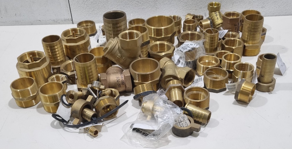 Brass pipe fittings lot, includes hose barb tail piece brass, hose nut tail and more...... Sold as lot