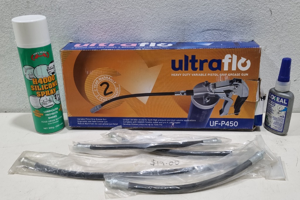 Assorted automative lot, includes ultraflo heavy duty pistol grip gun, silicone spray and more......
