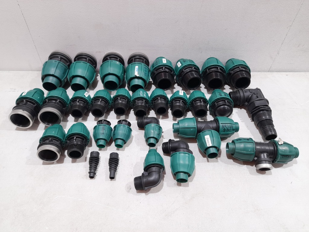 Assorted industrial pipe fittings, includes green & black elbows, T-pieces, joiners, reducer, and more...Sold as a lot