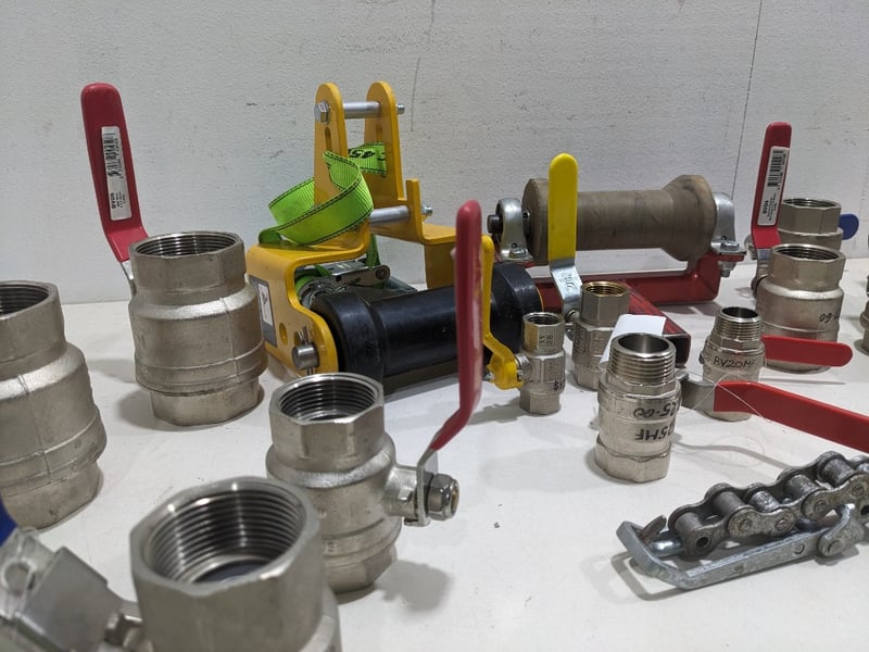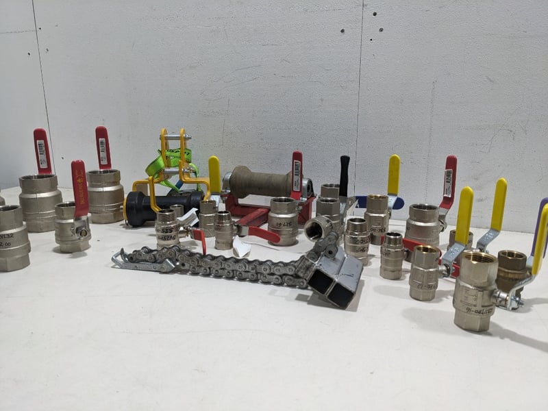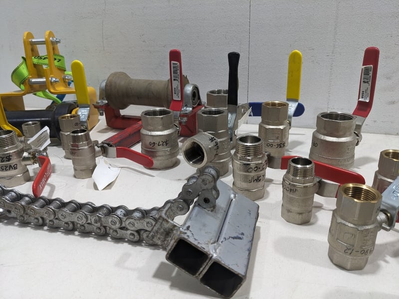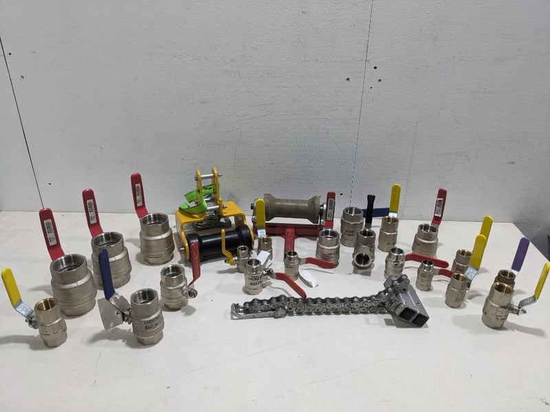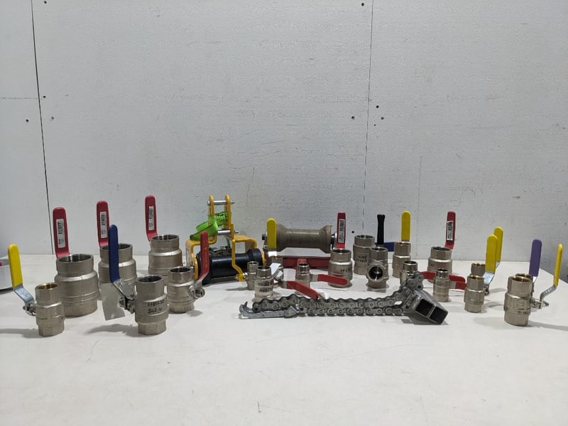 Assorted industrial items, includes ball valves, handle types, hose roller/guide and more...Sold as a lot.