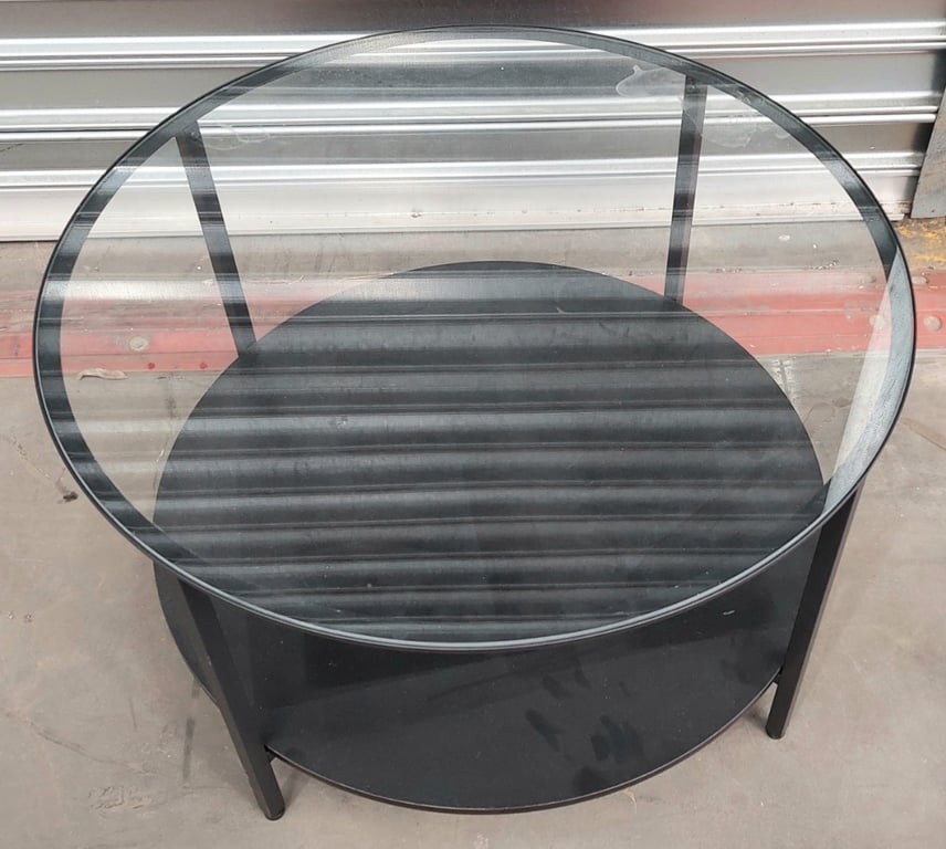 Coffee table, Round Glass Top Metal Frame, Black, Dimensions approx: 45cm H x 75cm Diameter