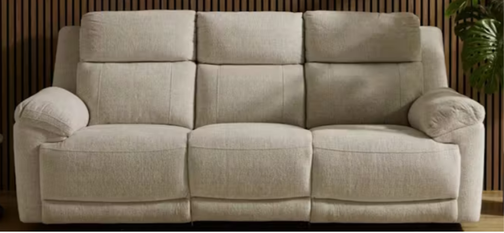 RRP: $1899, Eathon 3-Seater Fabric Powered Recliner Sofa - Beige, Model: VHNL-EATH-01