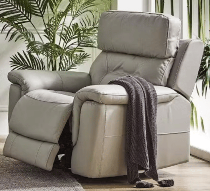 RRP: $1699, Carson Leather Powered Recliner Armchair - Light Grey, Model: CNSER(D)NWLGColour Light GreyNumber of Seats 1Frame Material Birch, Eucalyptus Timber, PoplarUpholstery LeatherReclining Mechanism ElectricSupport System Foam, No-Sag SpringBack Cushion Filling Material Loose Fibre, Rubber WebbingCushion Filling Material FoamProduct Width (cm) 112Product Depth (cm) 100Product Height (cm) 102Weight (kg) 55