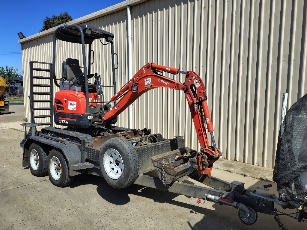Kubota U17-3 Excavator with attachment on 2023 Titan 28BP Trailer Year: 2022 Make: Kubota Model: U17-3 Body: Excavator Odometer Indicated: 814 hours VIN: KBCAZ24CAN3K56878 Colour: Red Seat: Open Description/Extras: 3 x buckets, ripper, rock hammer 2023 Titan 28BP Trailer Year: 2023 Make: Titan Model: 28BP Tare: 610 ATM: 2,800 Max load: 2,190 VIN: 6T9T20V86NAD1K065 Location: Mornington, VIC Contact: Gage Mackay - 0458 732 549 or [email protected]