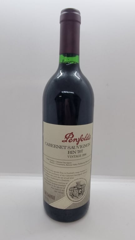 1996 Penfolds Cabernet Sauvignon Bin 707 Bottle no: 06715NOSE This brooding giant releases compelling barrel-ferment richness, enveloped by vibrant cassisfruit. Once allowed to breathe, complex berry andcassis Cabernet aromas emanate with abackground of cedary oak and violet nuances.PALATE Full bodied with dense layers of tight, saturatedCabernet fruit. A formidable concentration ofberried fruits, blackcurrant and anise combine tocreate a rich and expansive mid-palate. Stylishoak handling combined with a backbone of firm,yet finely grained tannins, support a lingeringfinish.