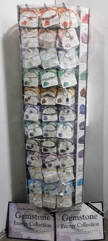 Gemstone energy collection, assorted crystal keyrings and jewelry displaySold as a lot