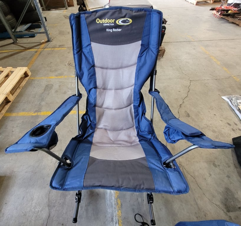 Description: Fold out rocking chair, 600D fabric, storage pocket, drink holder, high back rest, packs down and stored in carry bag, make: Outdoor Connection.