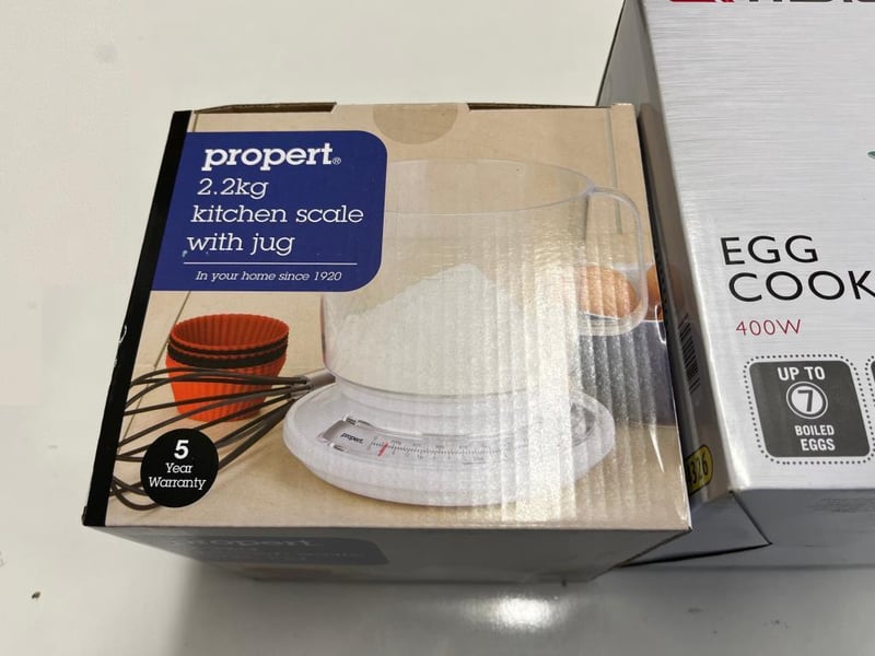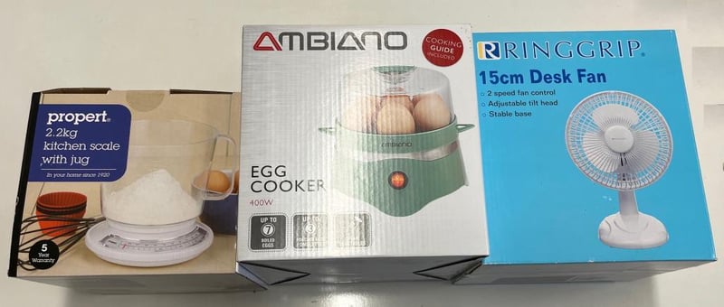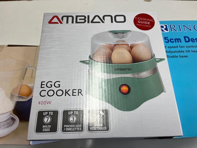 3 X New Items, Egg Cooker, Desktop Fan, Kitchen Scales with Bowl SOLD AS 1 LOT