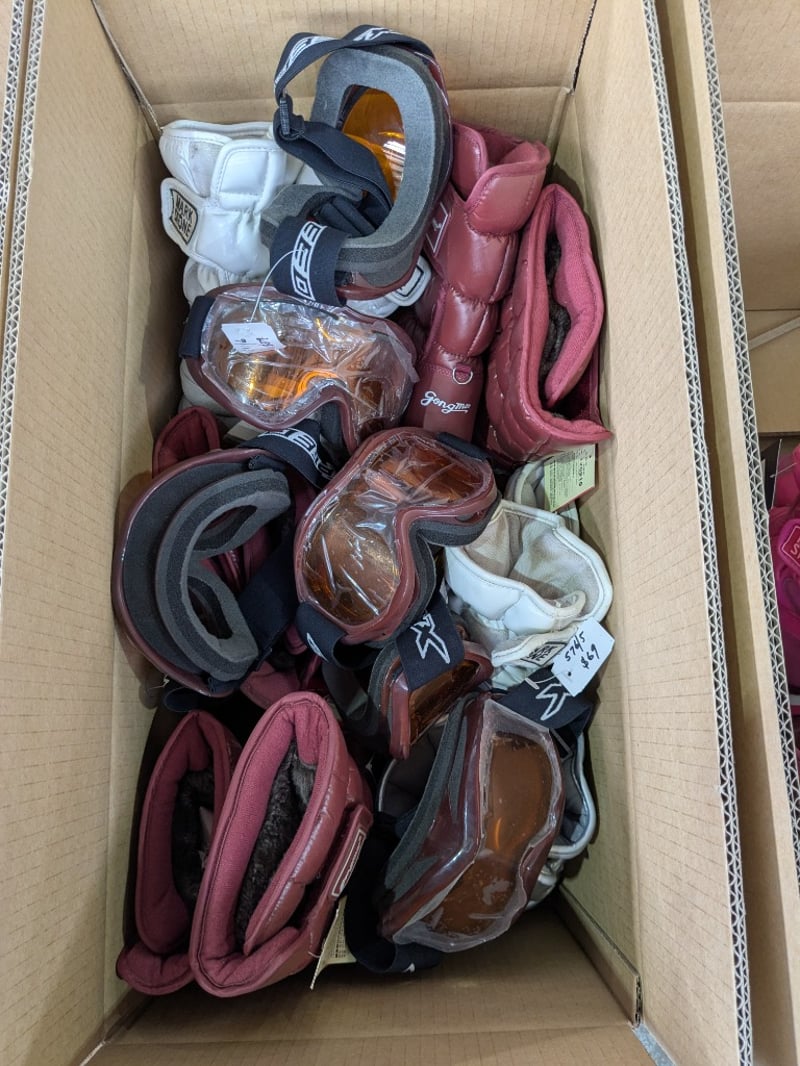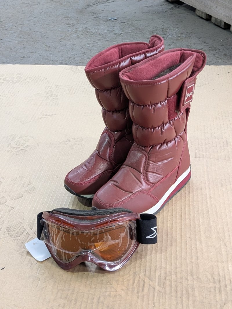 Clothing, assortment of various colours and sizes of moon boots, and ski googles