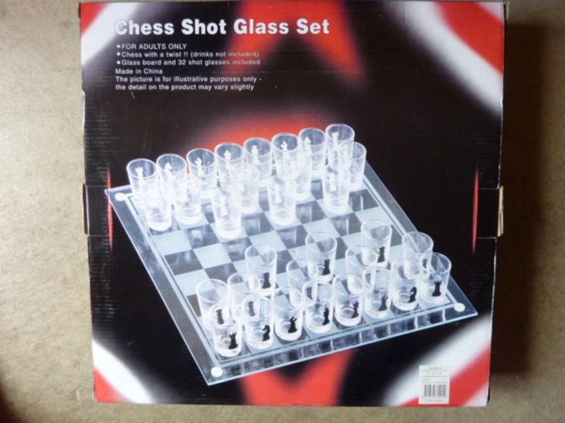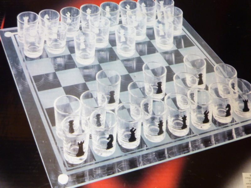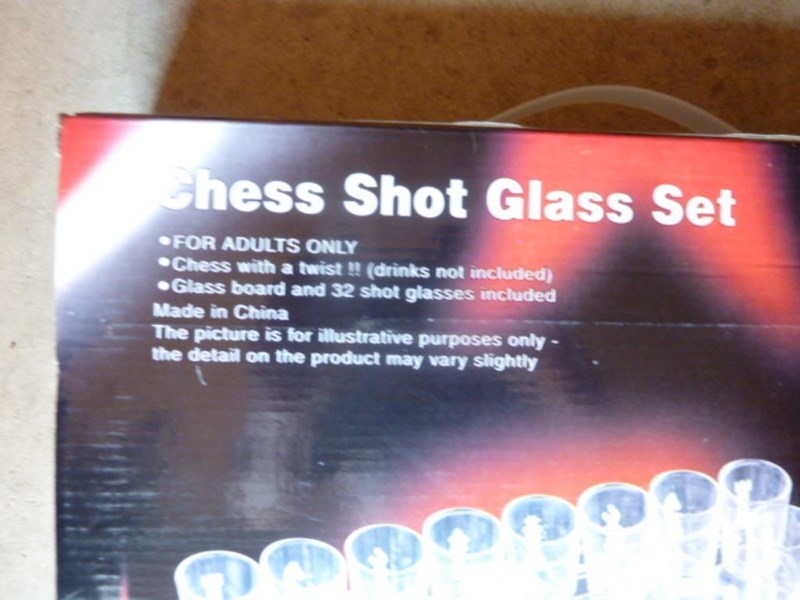 Chess Shot Glass set . With glass board and 32 shot glasses .
