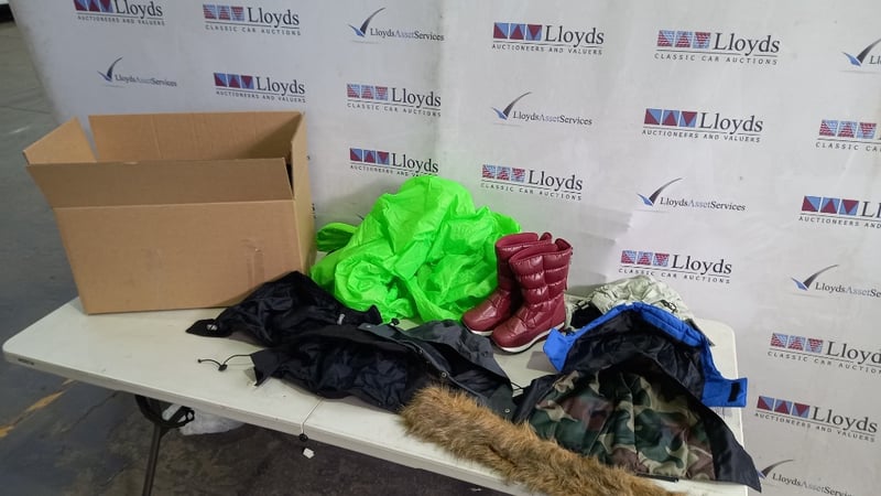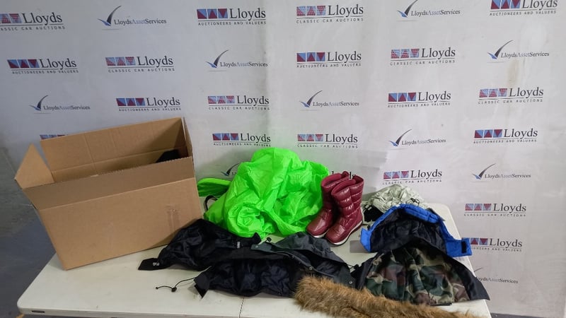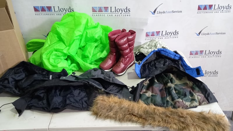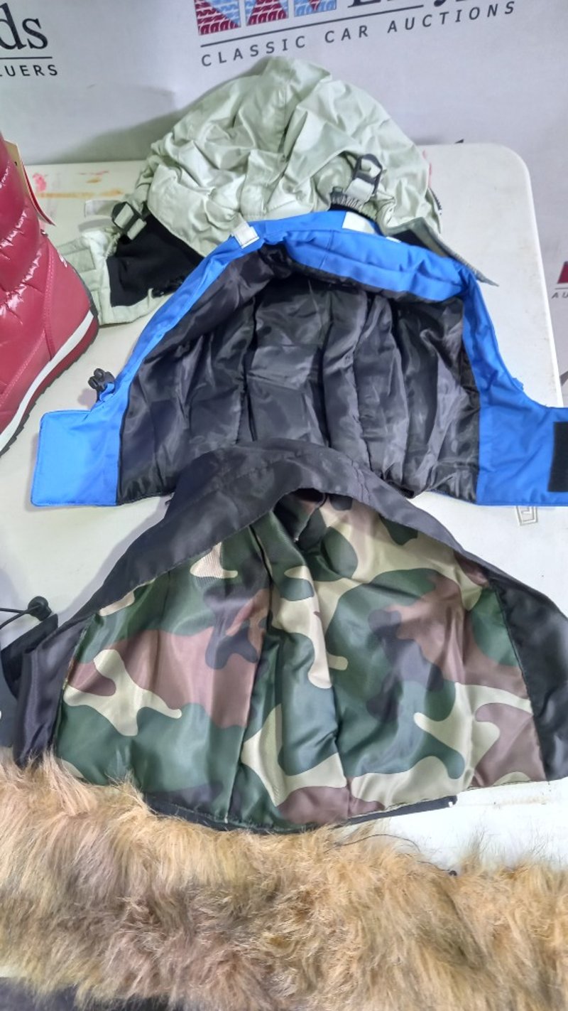 Clothing, box with moon boots, and various different hood attachmentsSold as lot