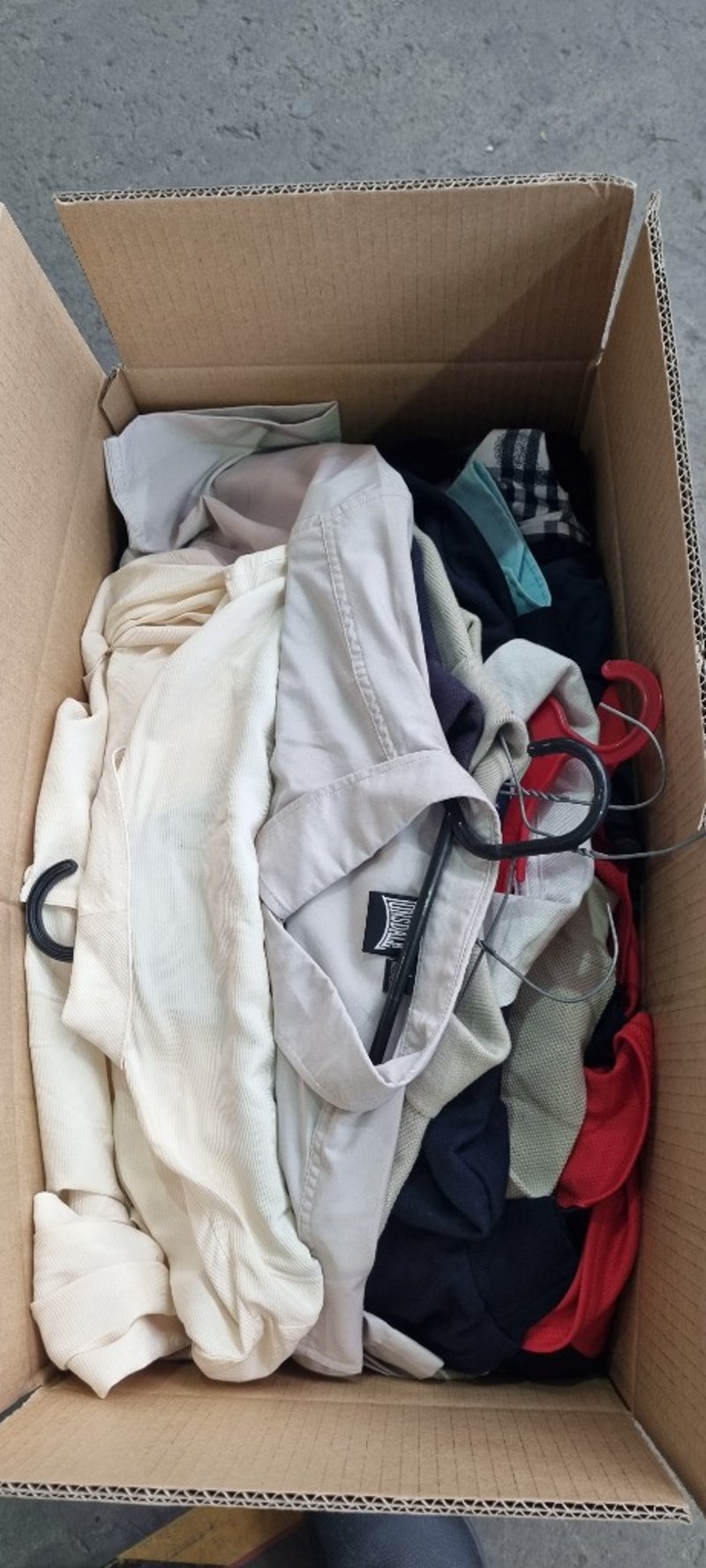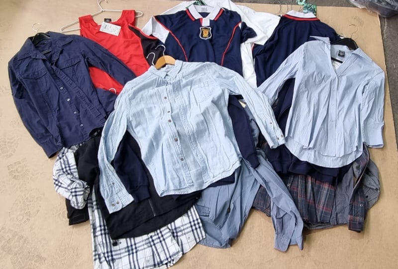 Clothing, mix gender clothing, in various colours and size. T-shirts, tank tops, pull over jumpers, long sleeve, vests, jackets random assortment Box contains 25 randomly assorted items Sold as lot