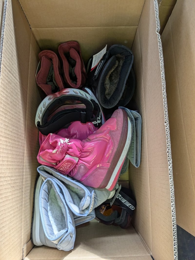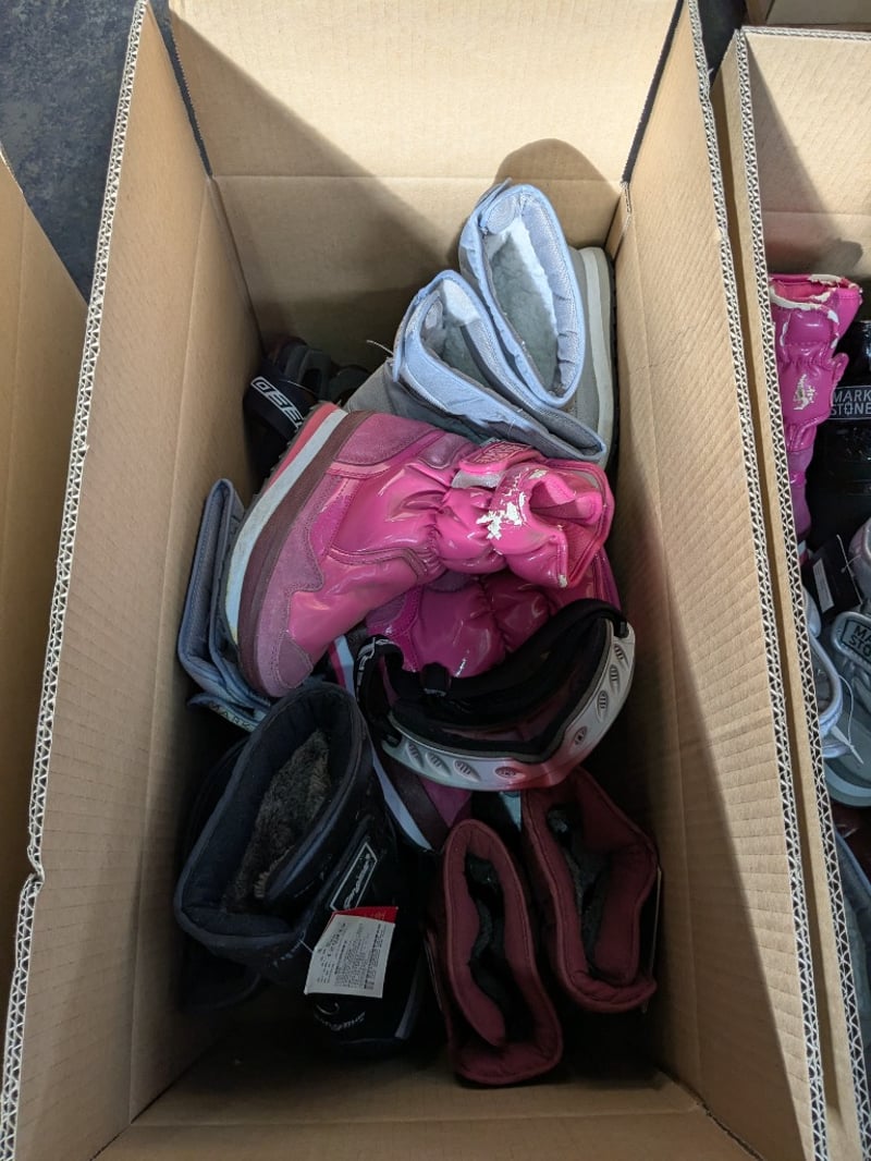 Clothing, assortment of various colours and sizes of moon boots, and ski googles