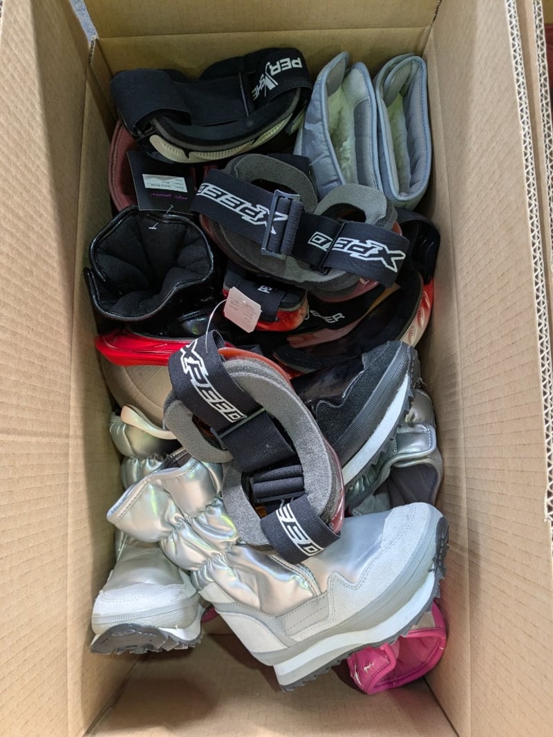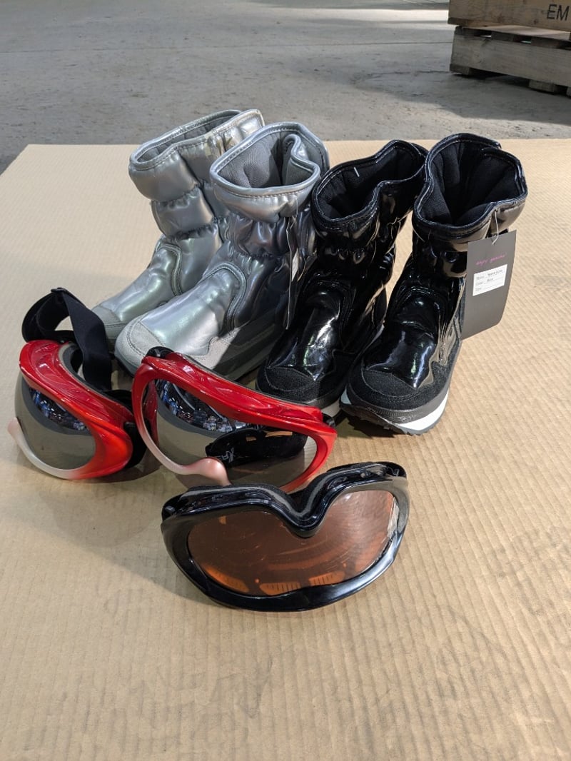 Clothing, assortment of various colours and sizes of moon boots, and ski googles Sold as lot
