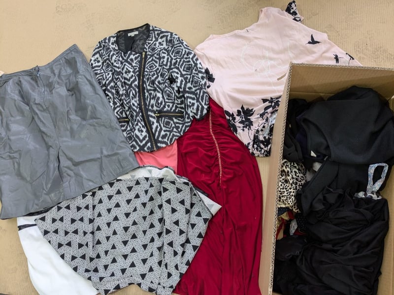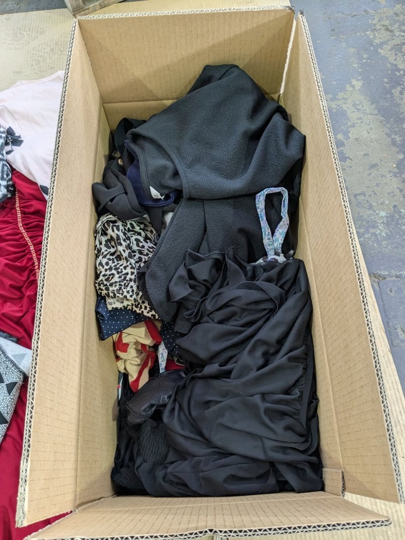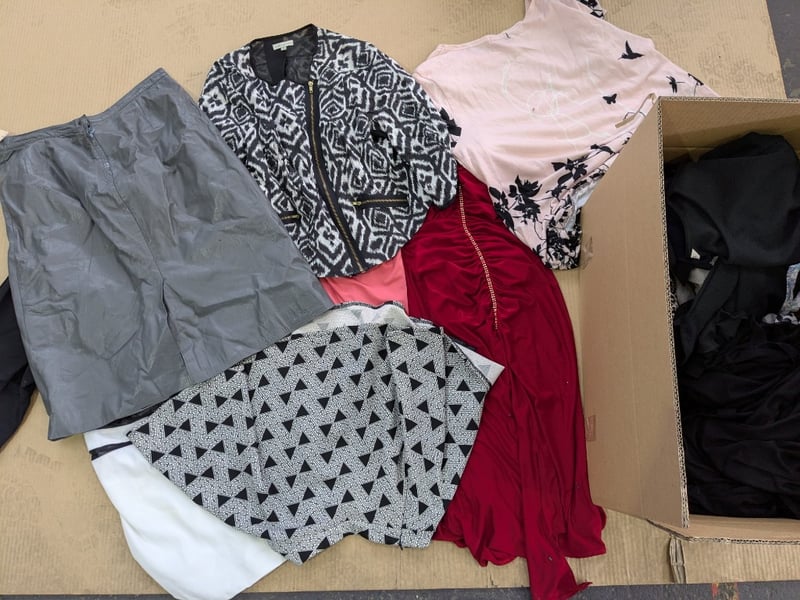 Clothing, box comes with an assortment of random men's and women's clothing - box contains 30 items, containing random assortment of tees, skirts, dresses shorts, etc Sold as lot