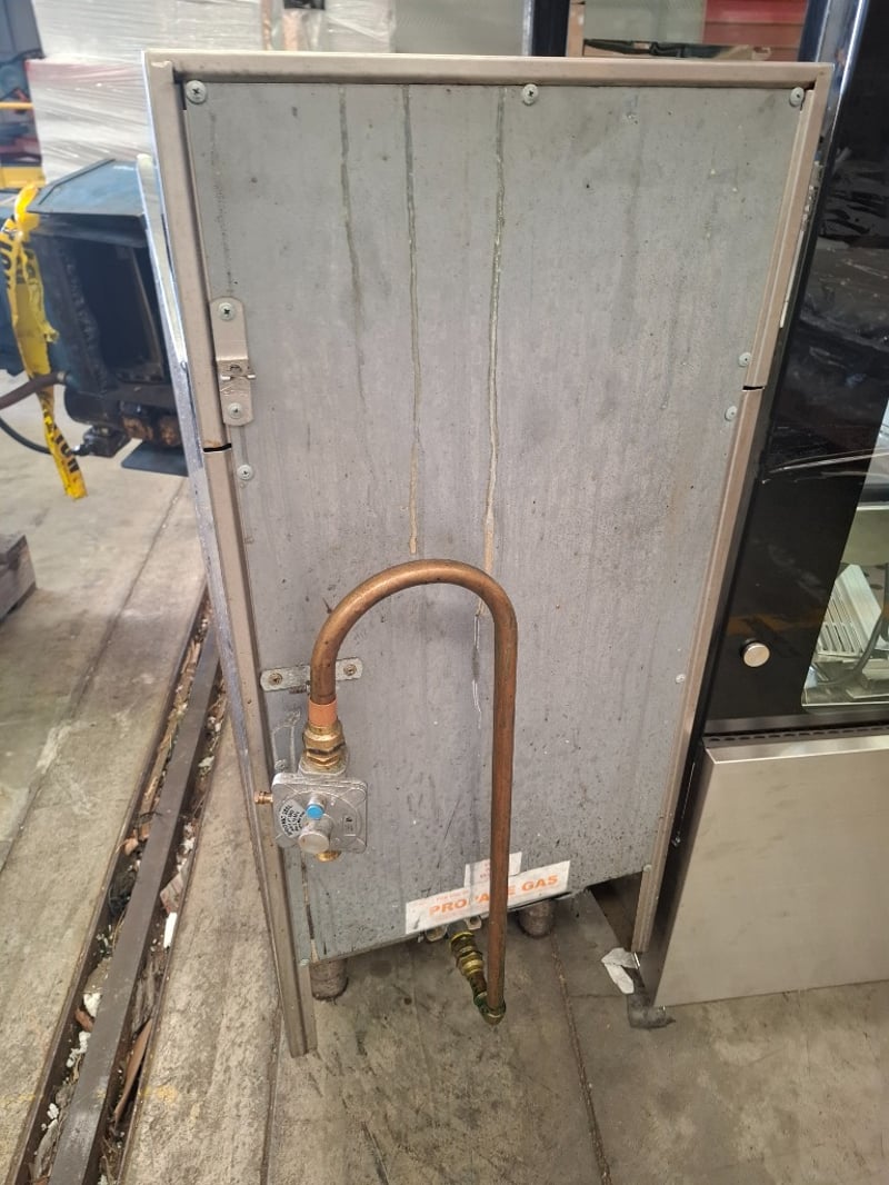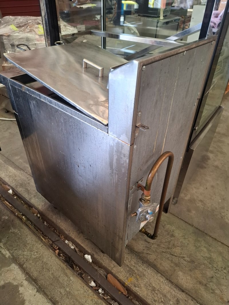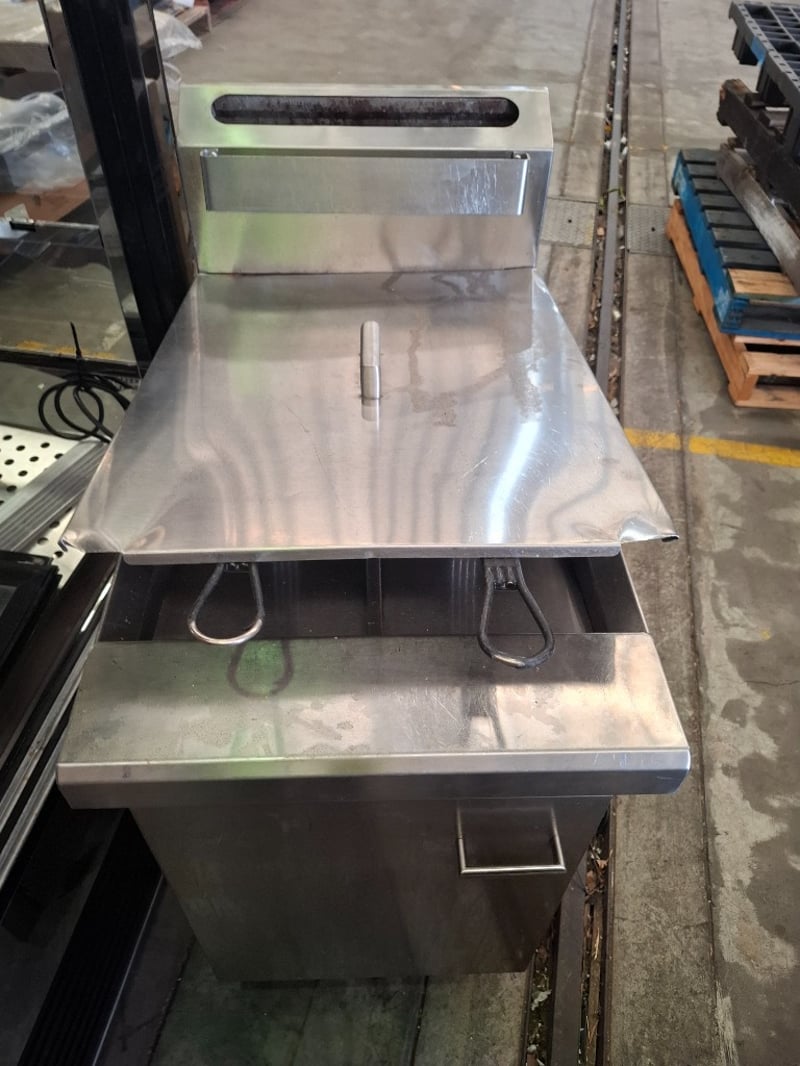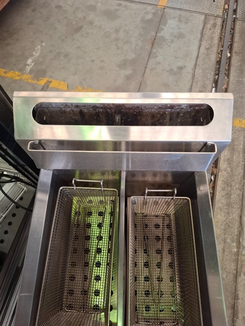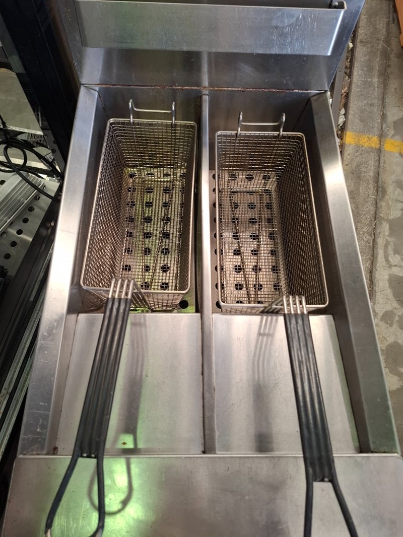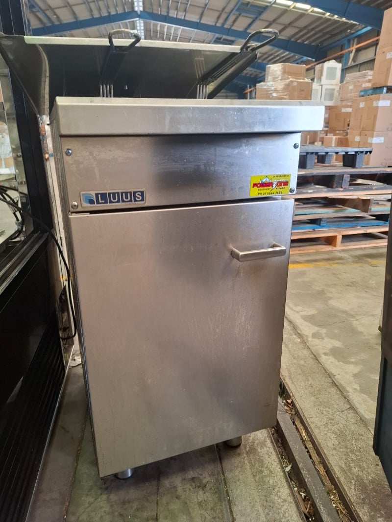 Luus FSV-45 FryerSplit Pan Fryer. Features Split Pan, 100 MJ/h, 2 Baskets, 11.5L Capacity per pan, Basket holder, Fish plate, Drainage spout, Adjustable feet, Night cover, Flame fail valve, Internal regulator, S/S finish, Scratches, L.P.G,450mmW x 850mmD x 1090mmH, 85KG