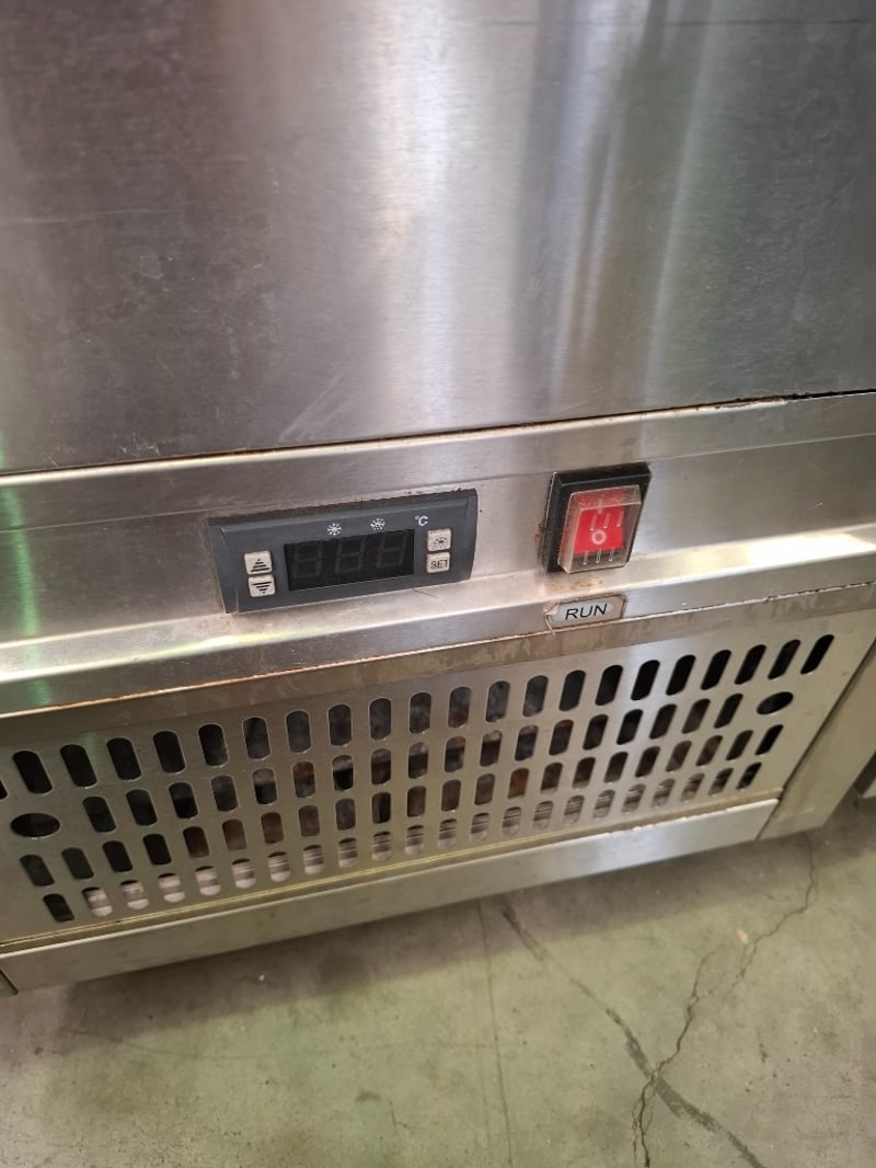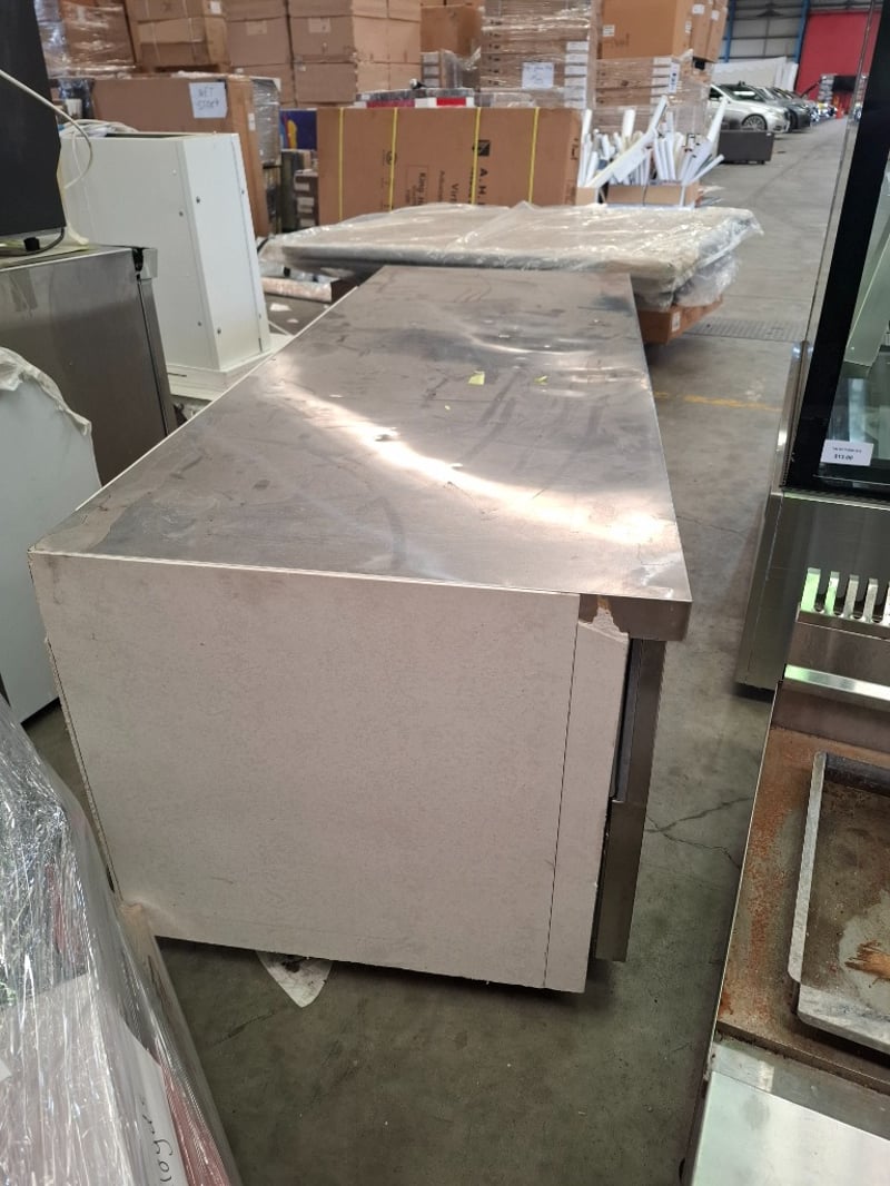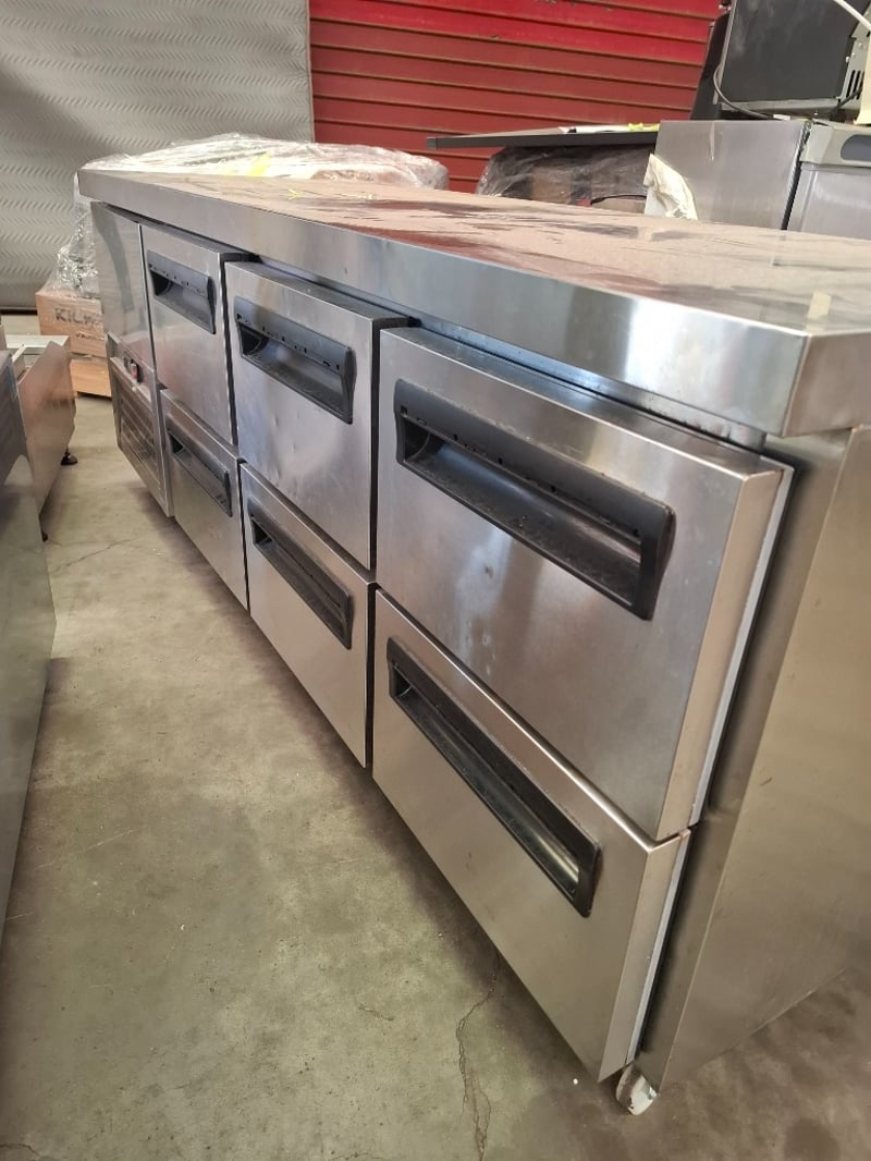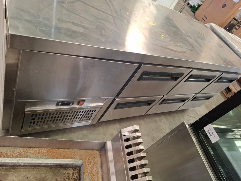 Undercounter Fridge. Features Motor on left, 6 Solid Drawers, Digital temp controls (2 - 8°c), Castors, Climate class normal, S/S finish, Scratches & dents, 10 amp 1 phase, 1800mmW x 700mmD x 700mmH, 122KG