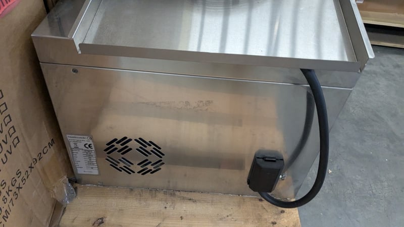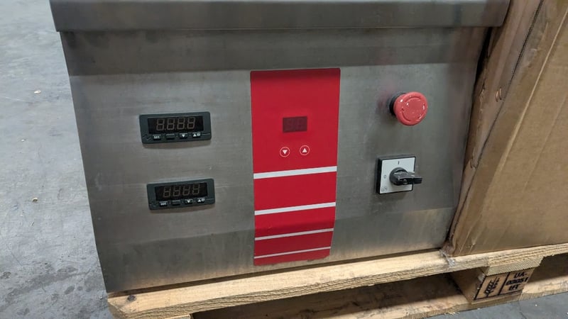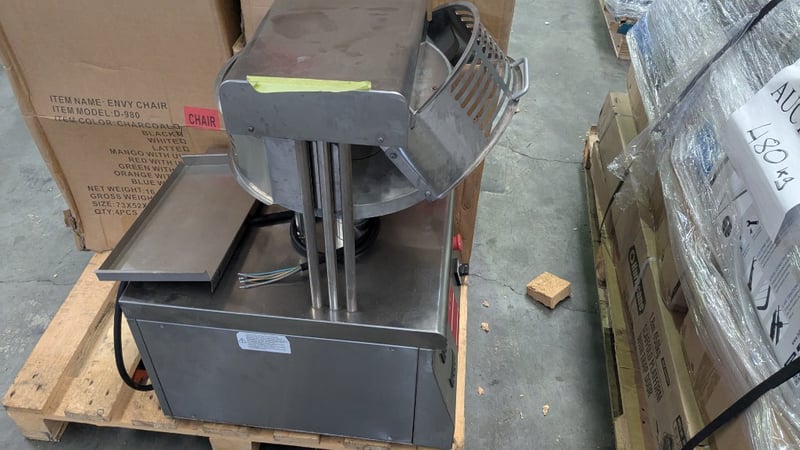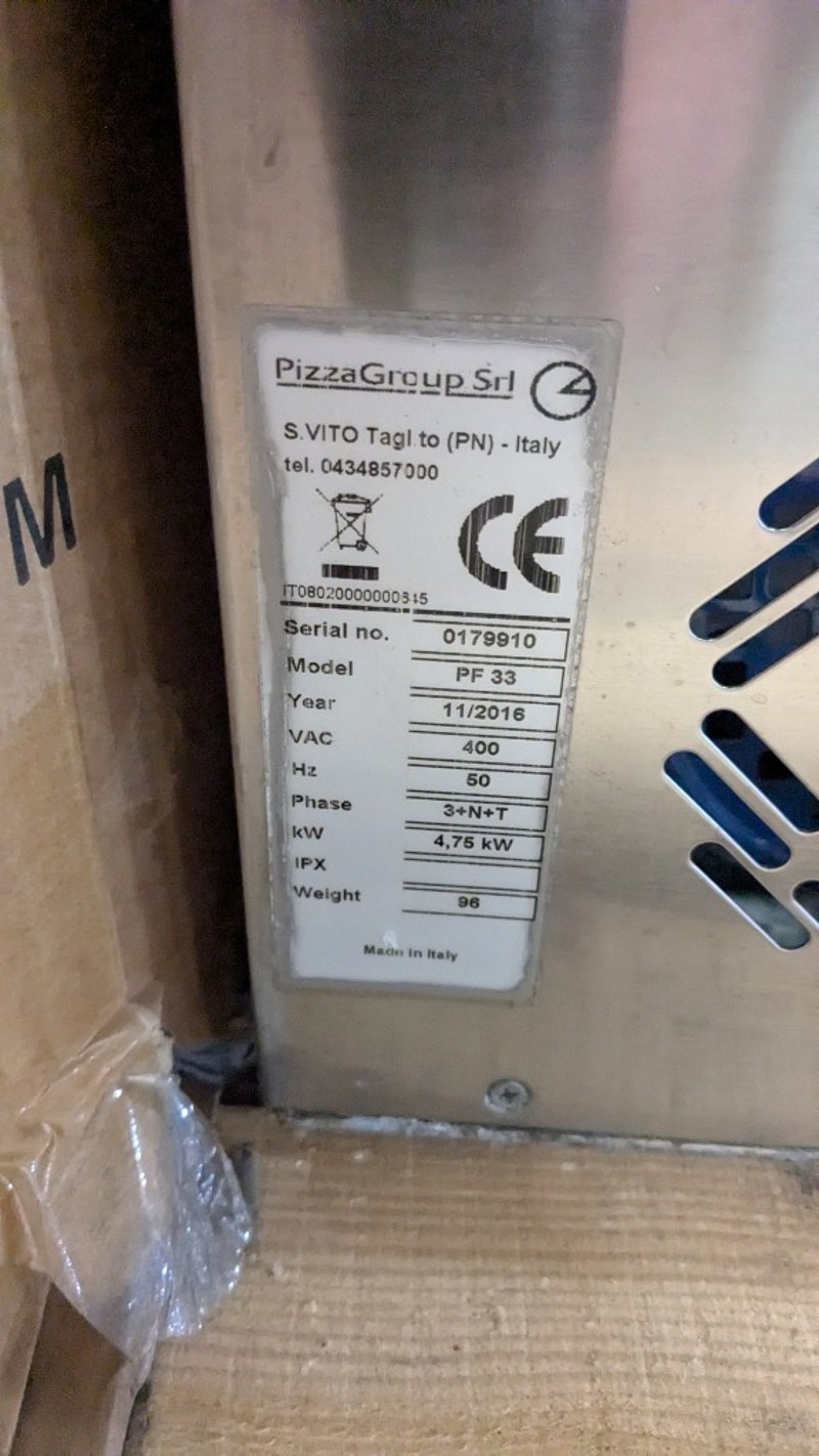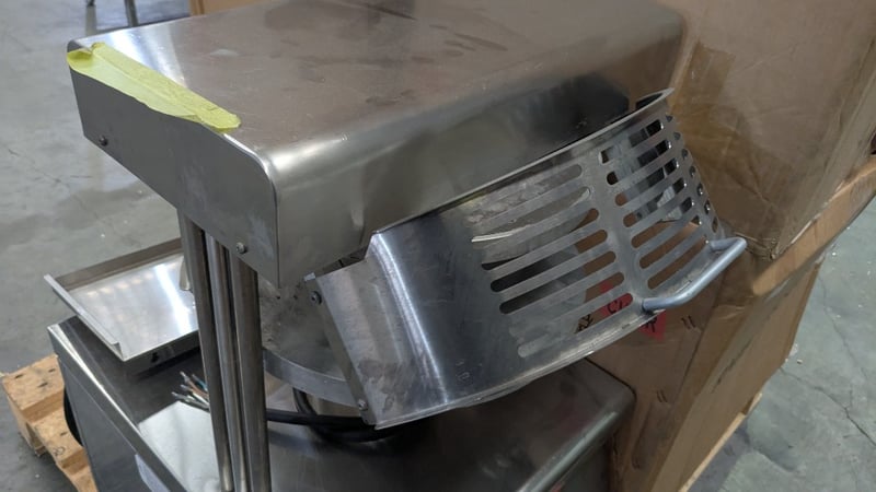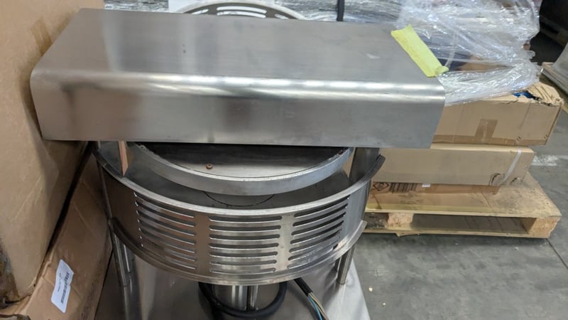 OMCAN PF33 Pizza ShaperPizza Shaping Machine. Features Non-stick plates, Rubber feet, S/S Finish, Scratches & Dents, Easy to adjust dough thickness, Pressing time from 0.1 to 1.5 sec, Safety guard, 10 Amp 3 Phase hard wired, 470mmW x 610mmD x 810mmH, 96KG