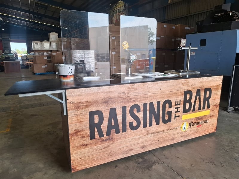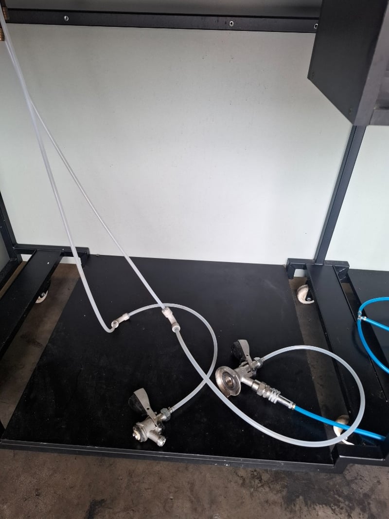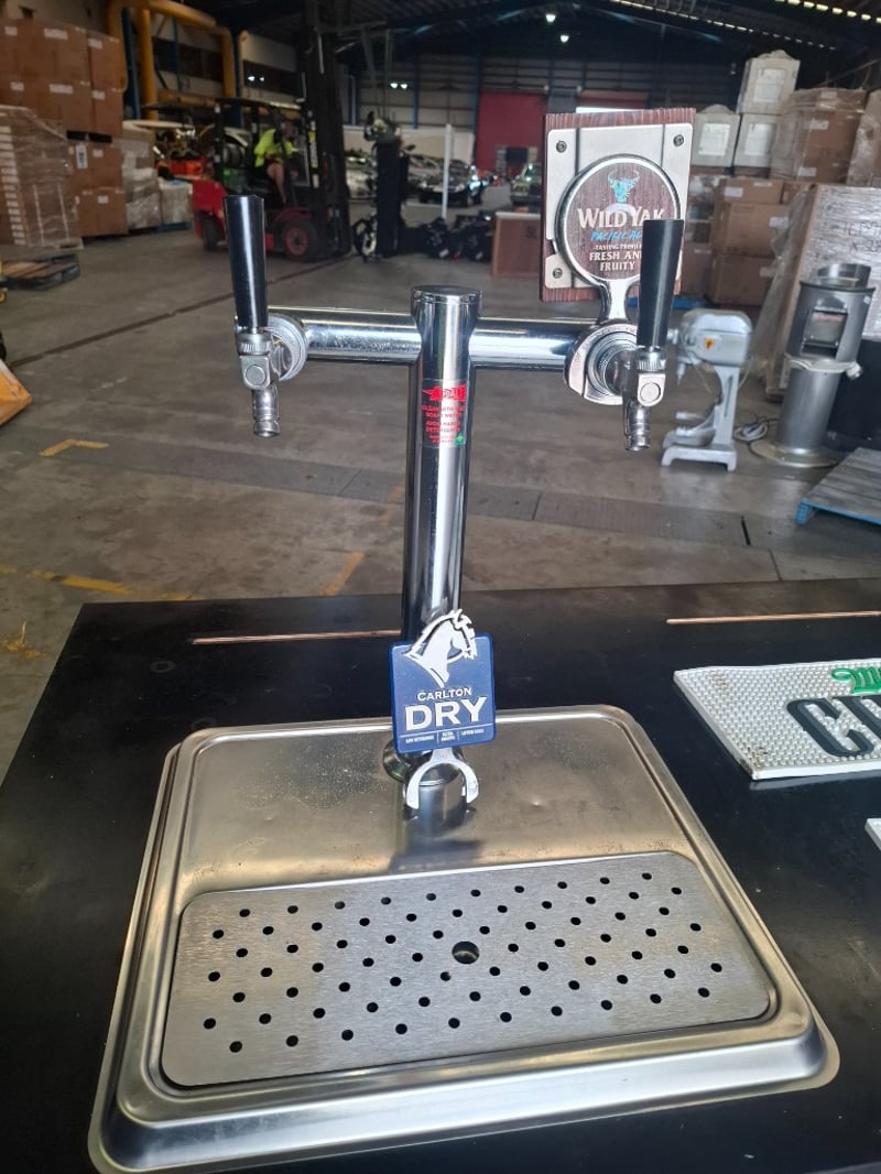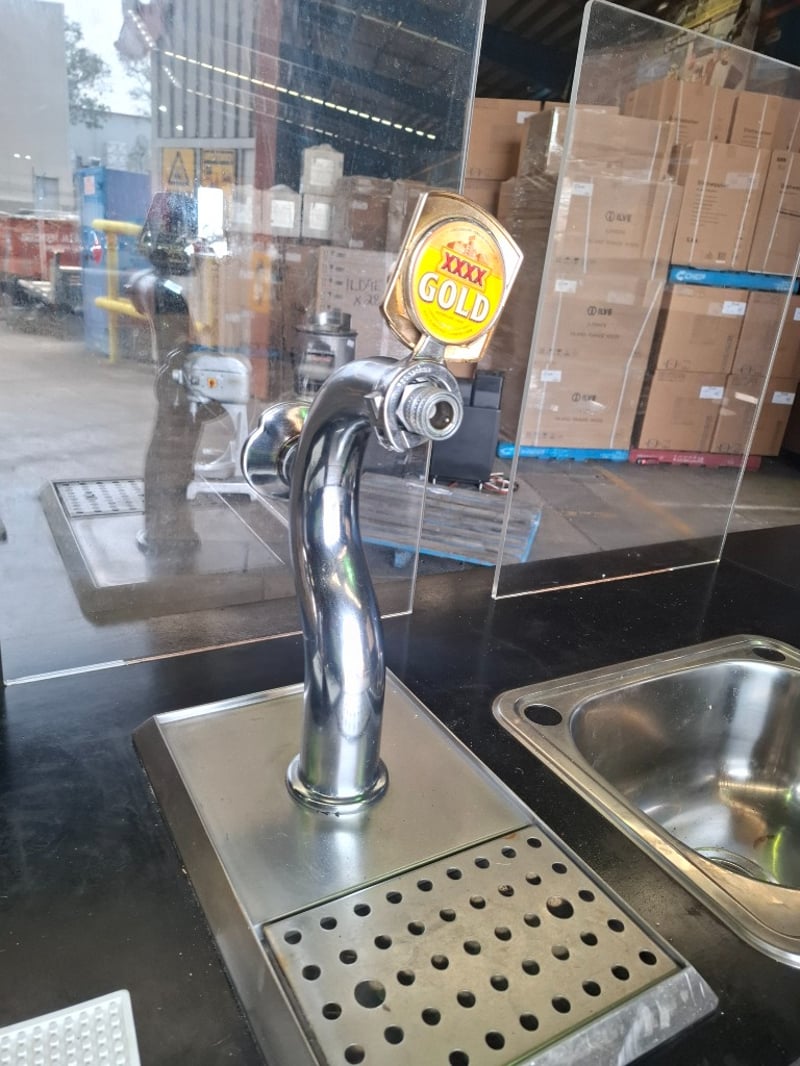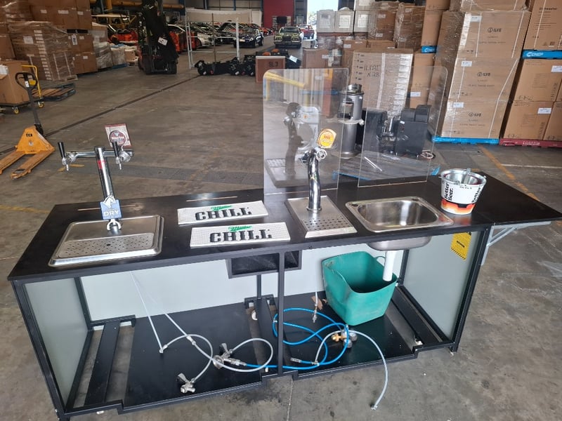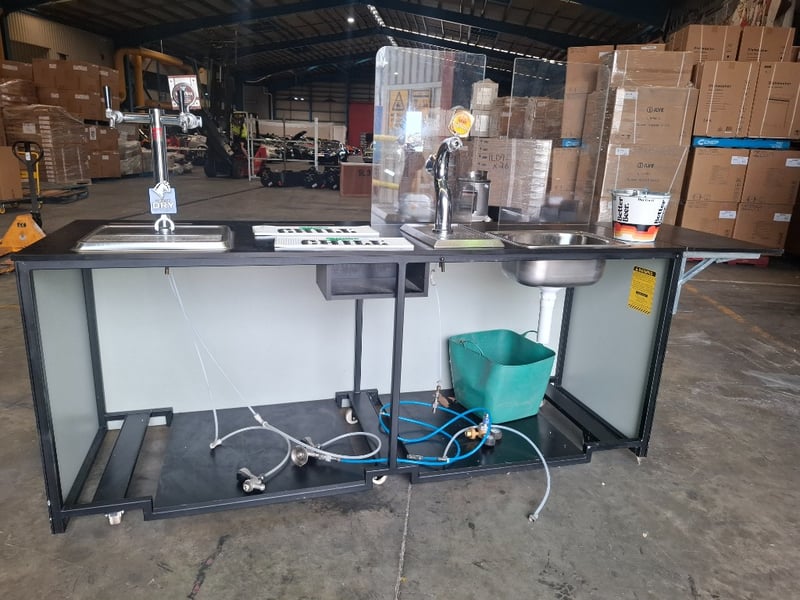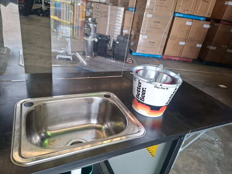 Portable single sink, Bar unit on cators wheels ,1 x single tap , 1 x double tap, includes pipes, 2 Acrylic shields, 4 buckets and a foldable table