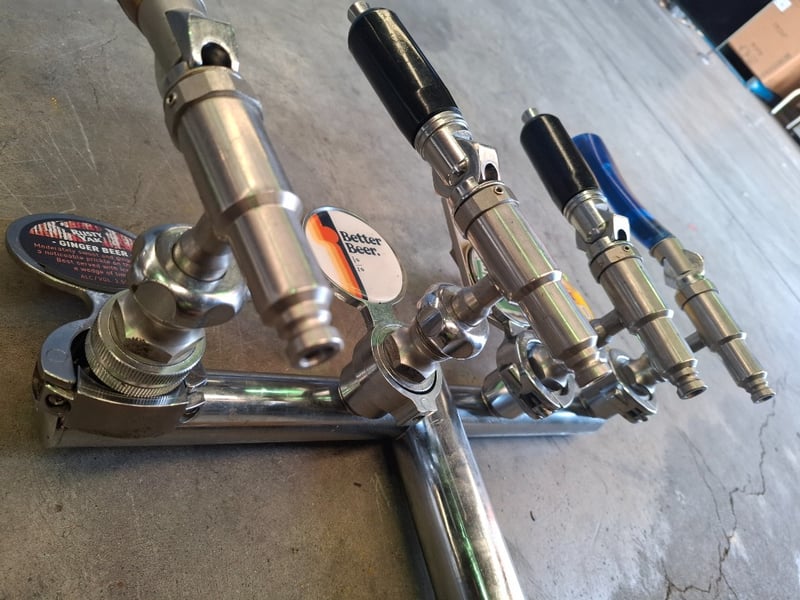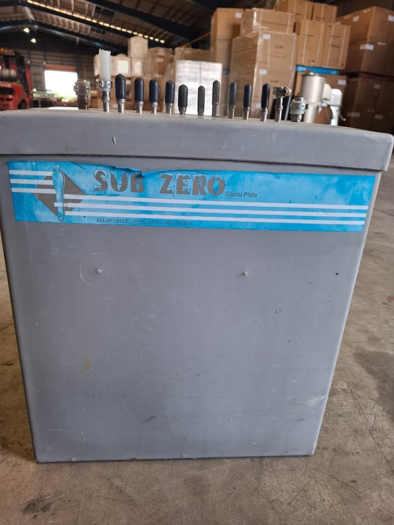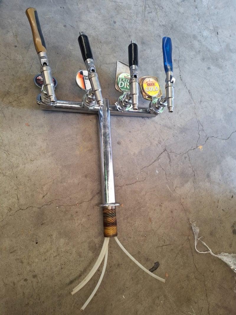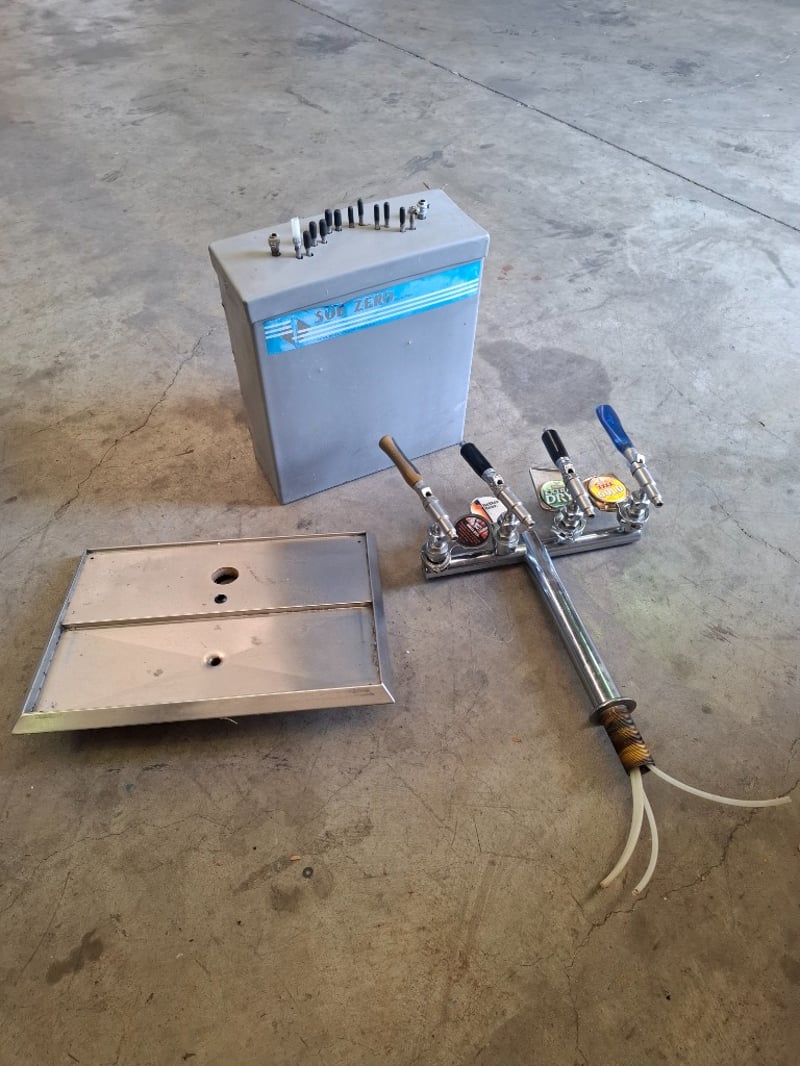 Multi-tap beer dispenser tower, 4 taps, bench stainless steel base and Sub Zero allied beer dispenser