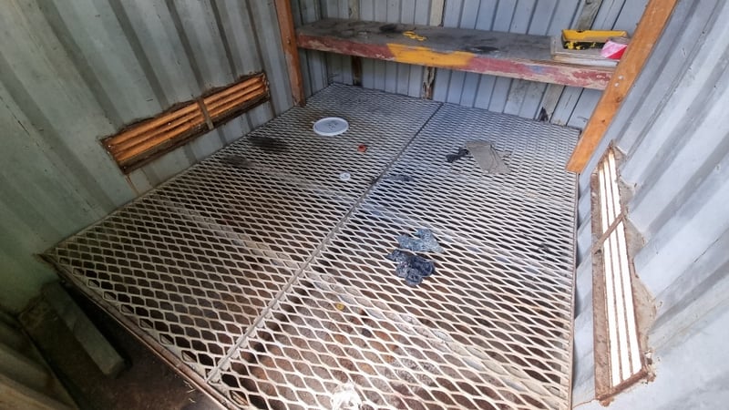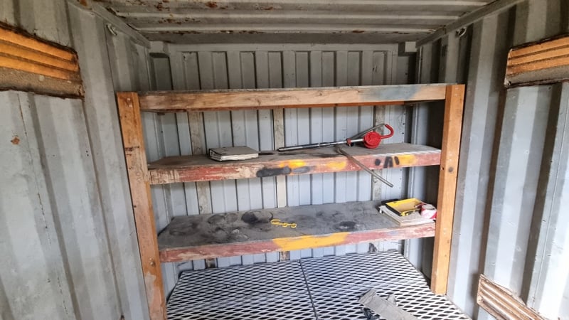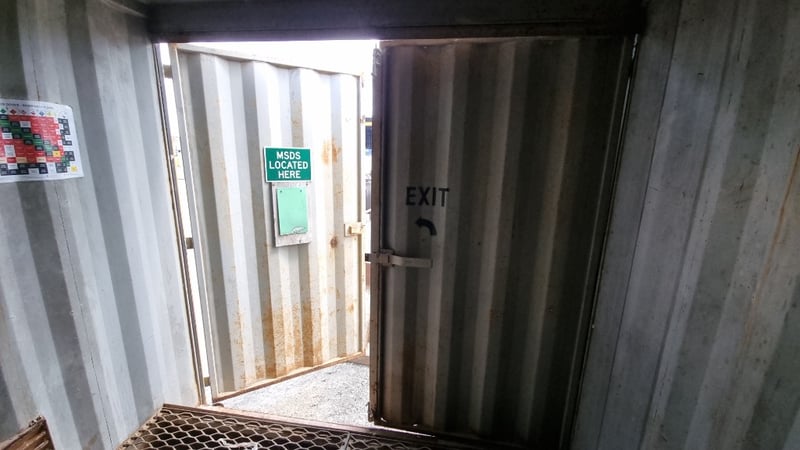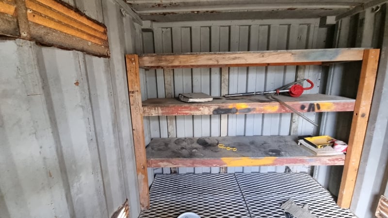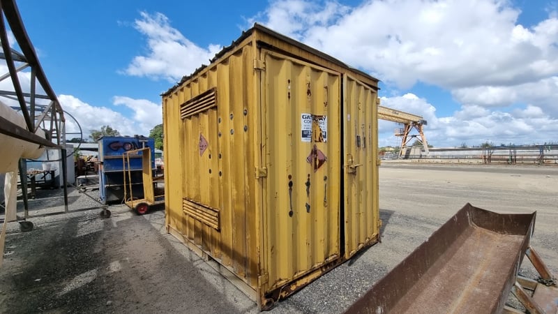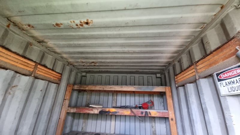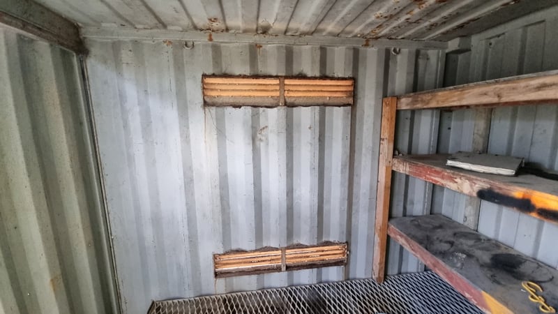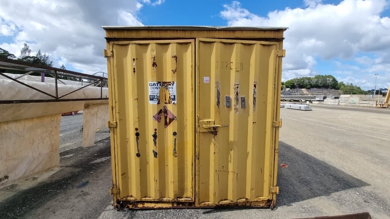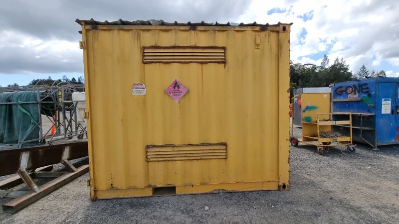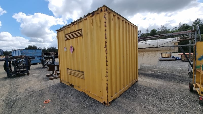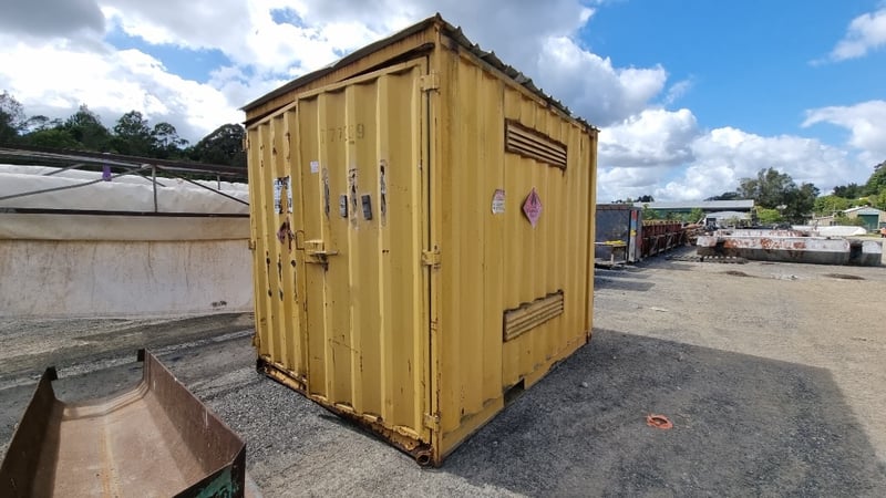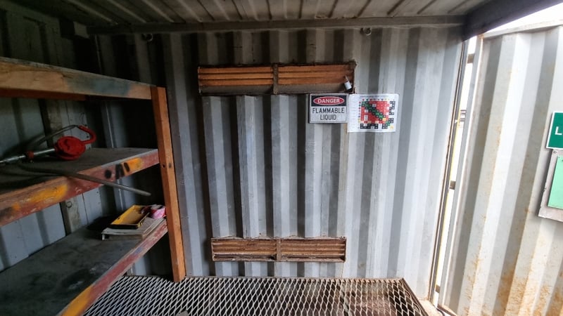 Chemical Container, Raised Grated Floor, Timber Shelves, 4 × Vents, Dimensions 250xm(H)×243cm(W)305cm(D)Location: Macksville, NSW