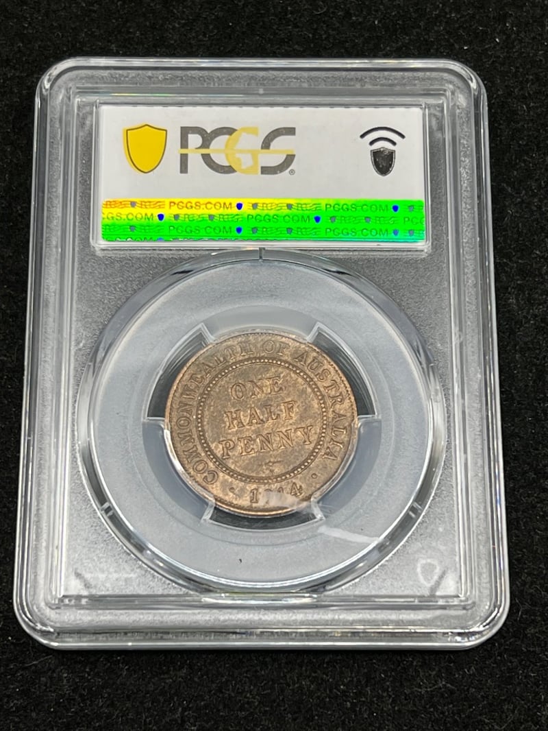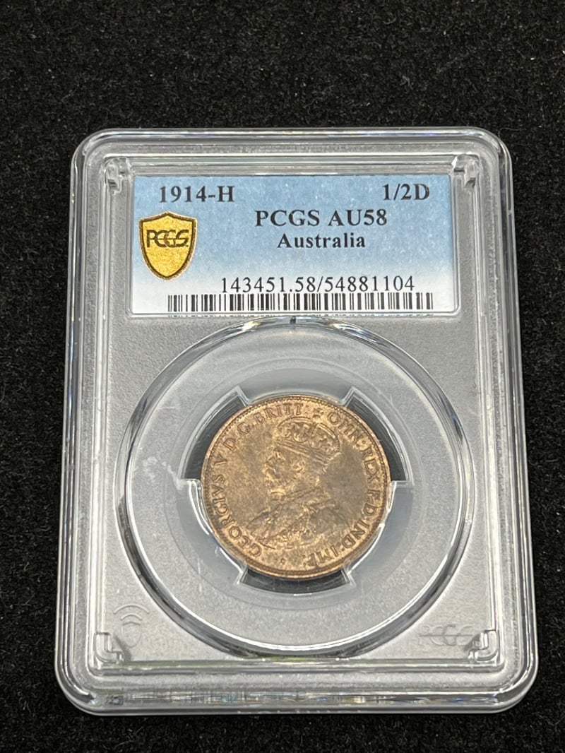 AUSTRALIAN 1914-H PCGS GRADED AU58 HALFPENNY COIN. (page 47 Renniks 32nd edition value $500) Condition: AUNC 587616+23