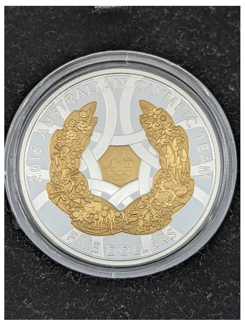 ROYAL AUSTRALIAN MINT 2016 AUSTRALIAN OLYMPIC TEAM 1OZ SILVER SELECTIVELY GOLD PLATED COIN. Condition: Proof235247+18