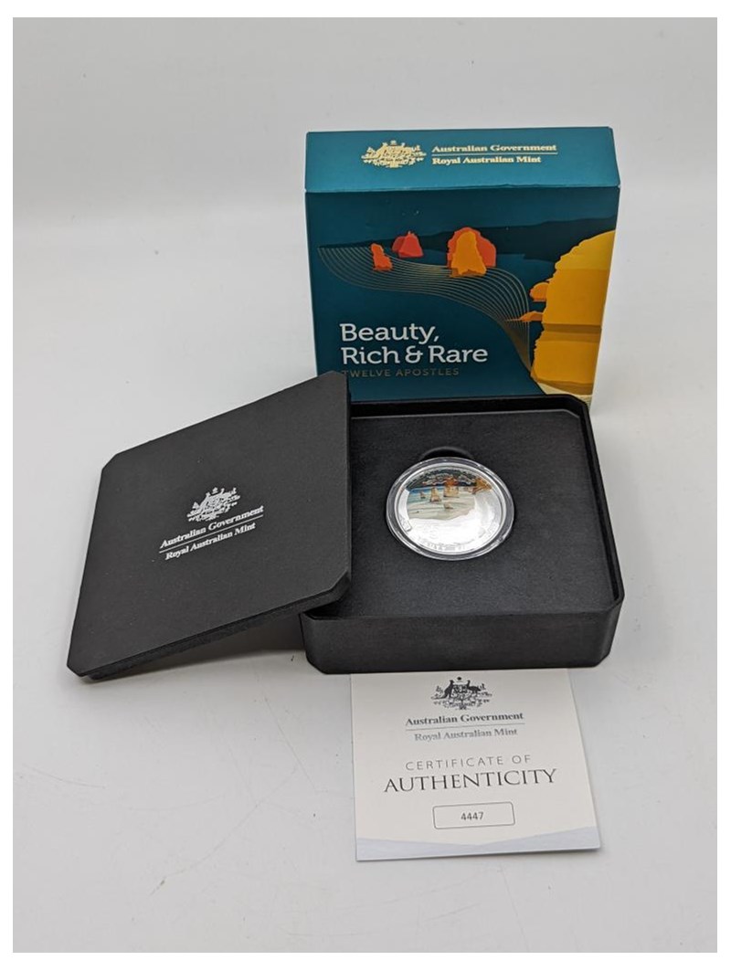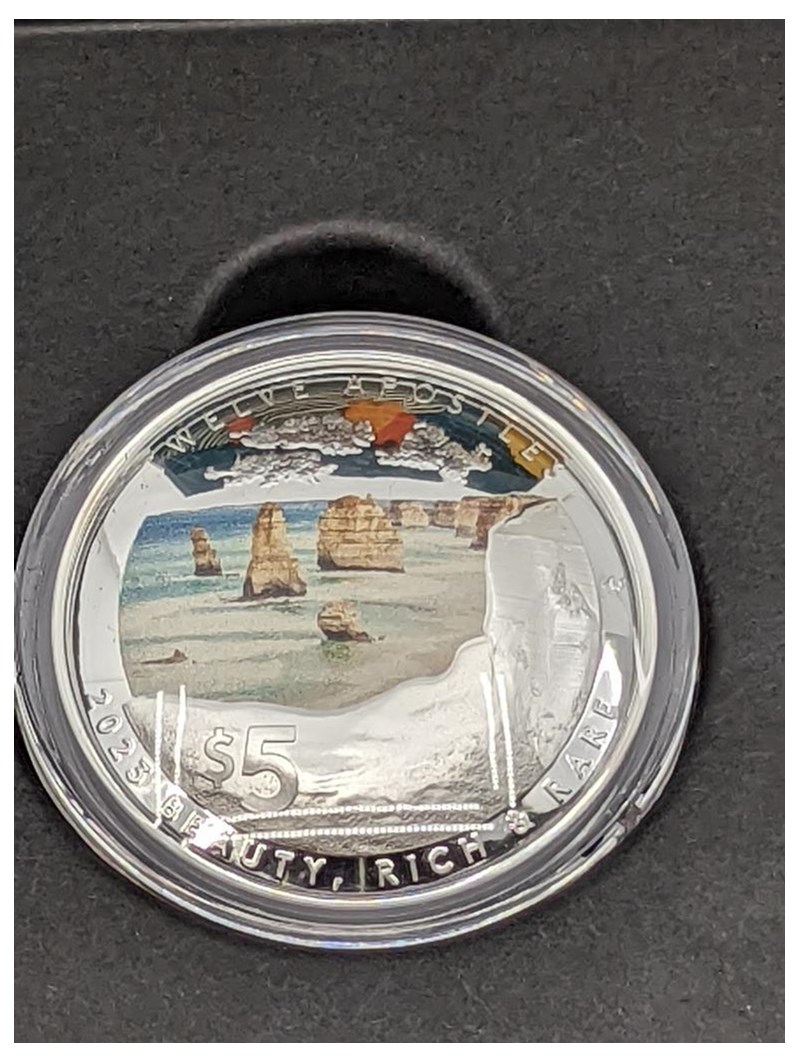 ROYAL AUSTRALIAN MINT 2023 BEAUTY, RICH & RARE TWELVE APOSTLE DOMED COLOURISED 1OZ DOMED SILVER $5 COIN. Condition: Proof235247+28