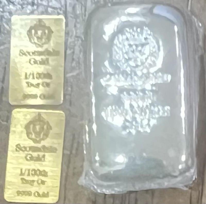 SCOTTSDALE LION 1/100OZ 9999 GOLD BULLION BAR X 2 & 1- OUNCE SILVER GERMANIA BAR UNC 23528+35