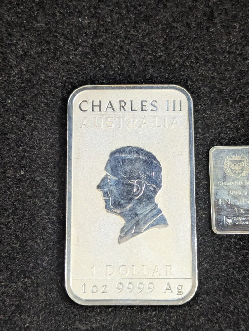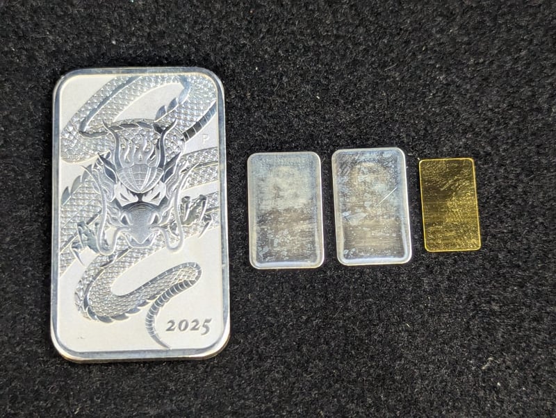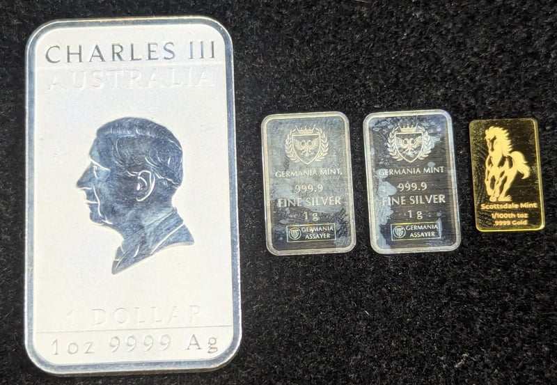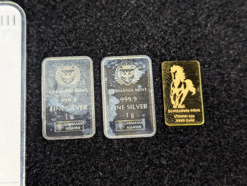 1/100TH OZ SCOTTSDALE GOLD BAR, 1 OZ SILVER YEAR OF DRAGON RECTANGULAR COIN AND TWO 1 GR GERMANIA SILVER BARS584958+3