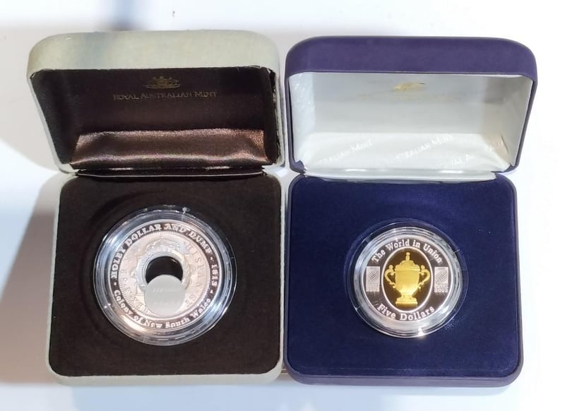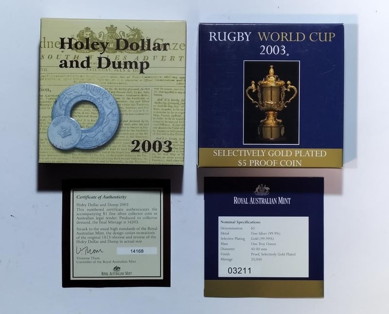 $5 Rugby World Cup Selectively Gold Plated Silver Coin #3211 1 Troy Ounce Silver & $1 Subscription Coin Holey Dollar & Dump Silver Proof Coin #14168 54.30G Silver