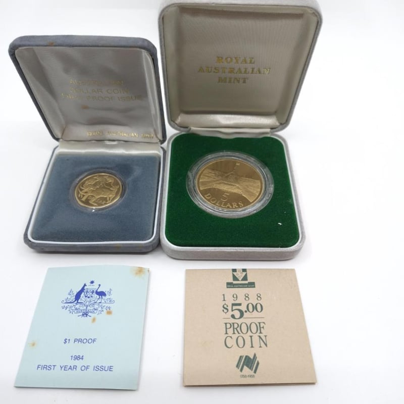 TWO ROYAL AUSTRALIAN MINT 1984 AND 1988 $1 AND $5 COINS. PROOF Condition: Good587689+62