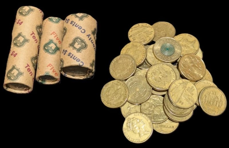 33 AUSTRALIAN DOLLAR COINS WITH TWENTY, TEN & FIVE CENT COIN ROLLS