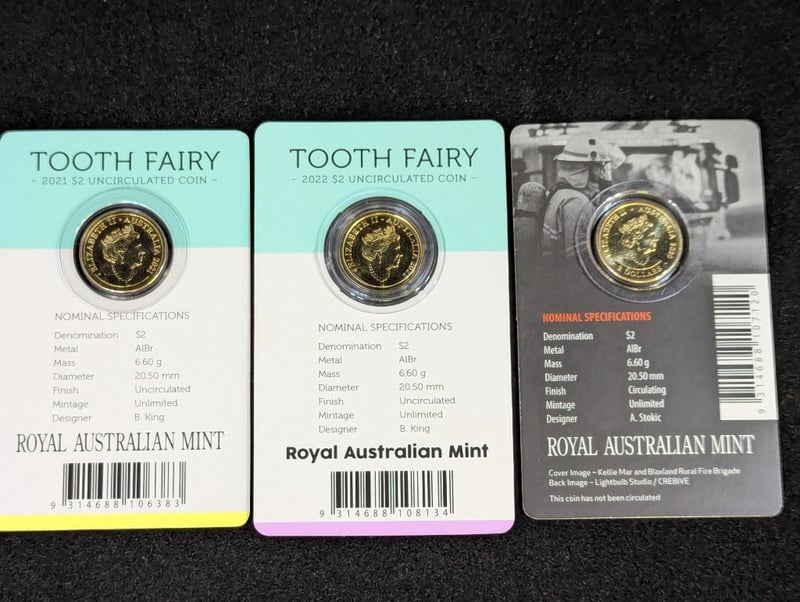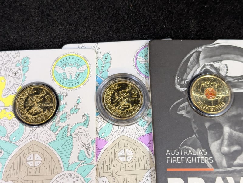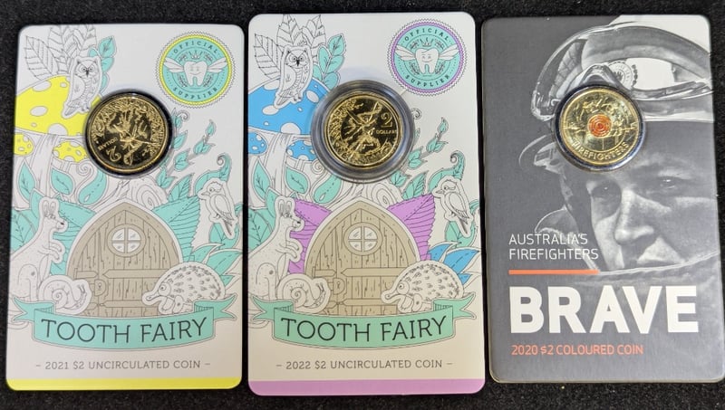 THREE AUSTRALIAN TWO DOLLAR COINS IN COLLECTOR CARDS Includes 2021 And 2022 Tooth Fairy Two Dollar Coins And 2020 Australia'S Firefighters Coloured Two Dollar 584954+2