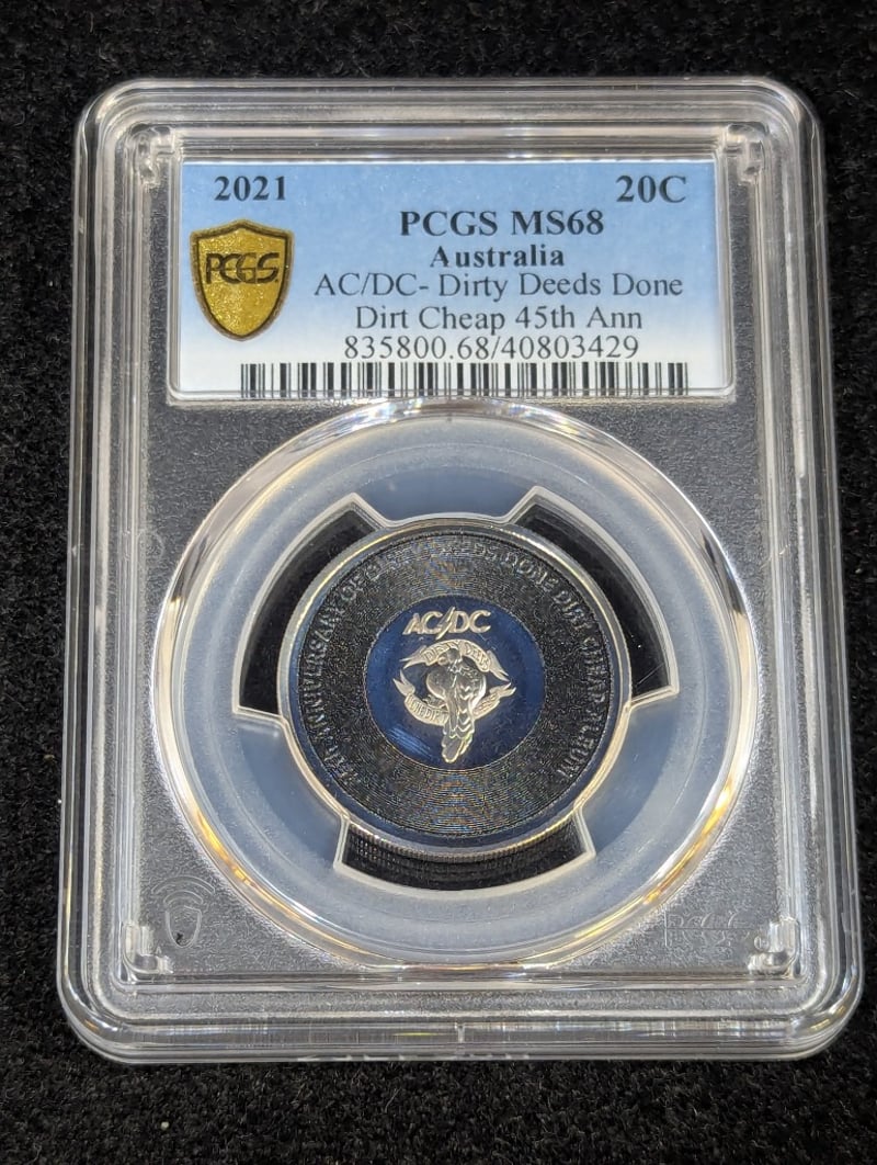2021 PCGS GRADED AC/DC DIRTY DEEDS DONE 45TH ANNIVERSARY TENTY CENT COIN, MS68
