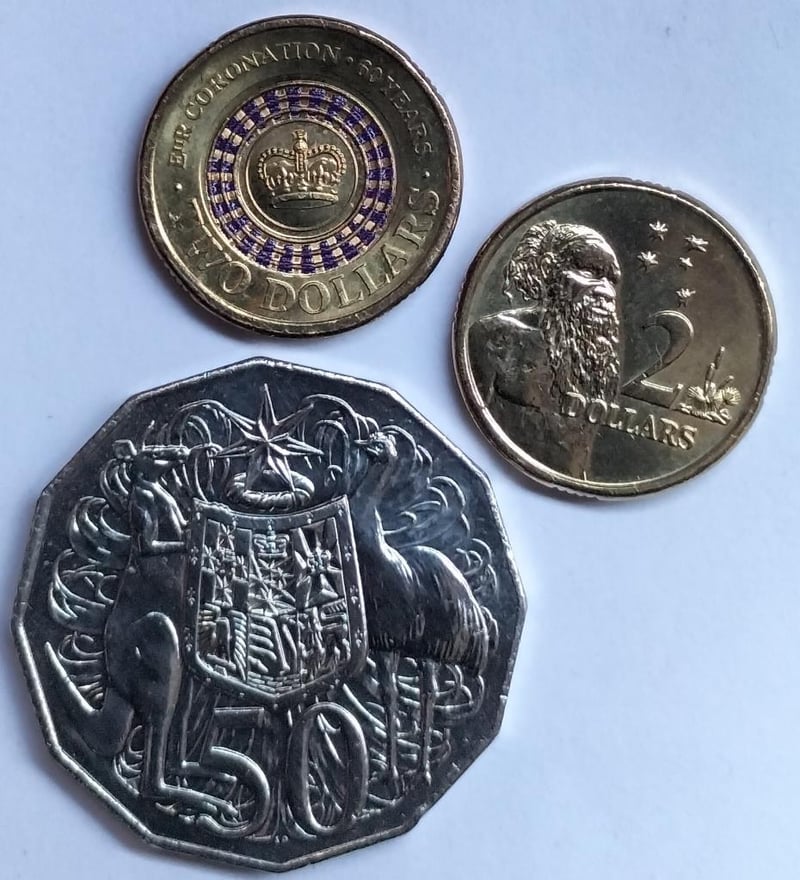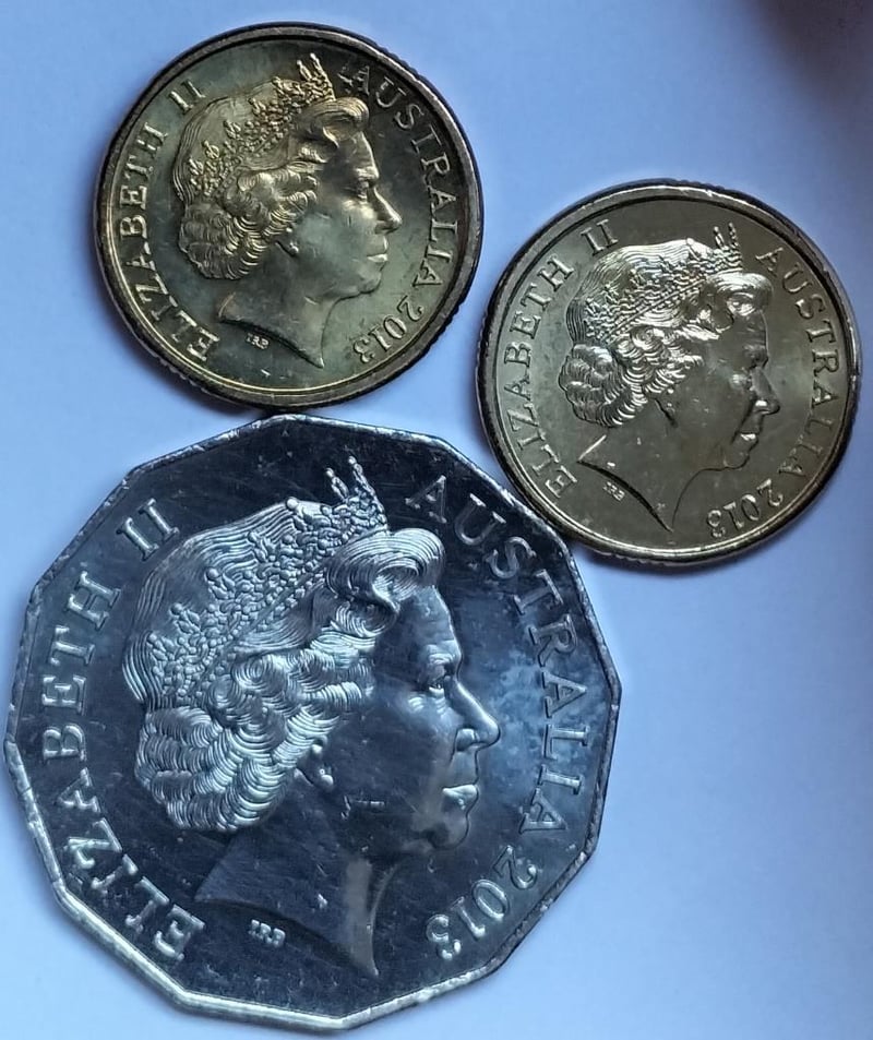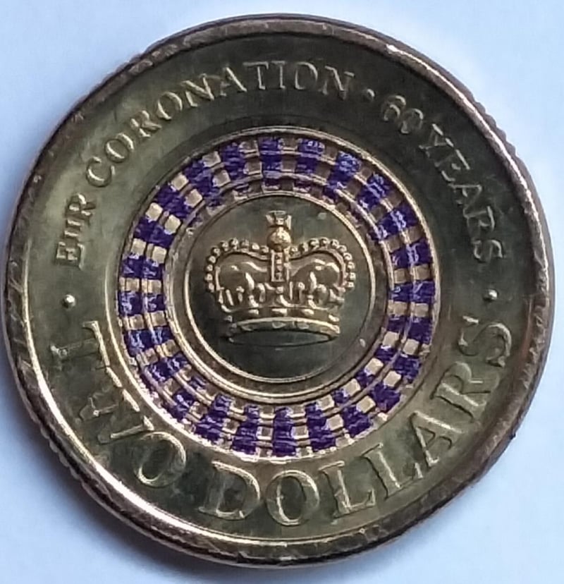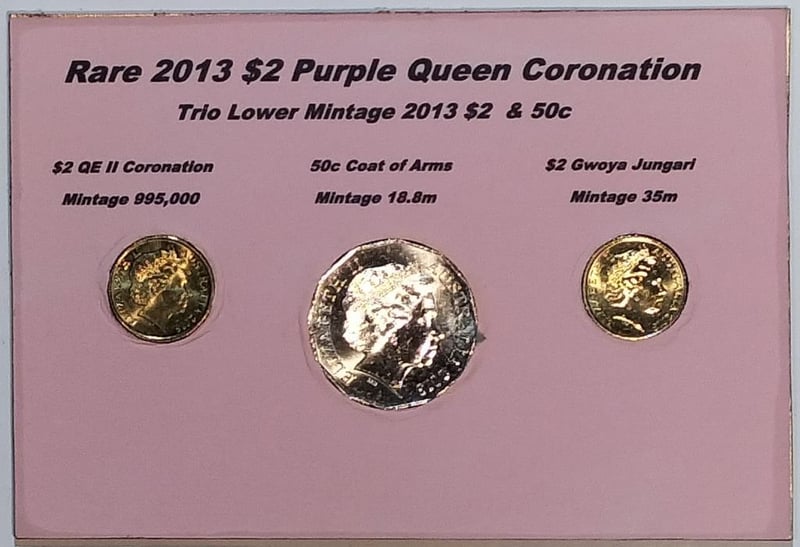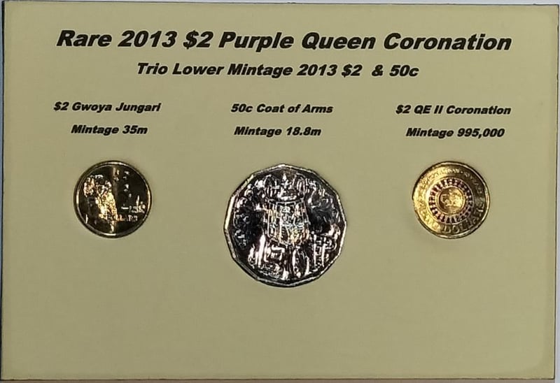 2013 TRIO COIN SET - RARE DUAL $2 PURPLE QUEEN CORONATION & ABORIGINAL ELDER AND 50C COAT OF ARMS Ex Mint Roll 488325+1